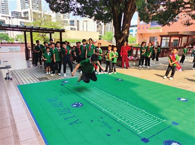 “教学楼各处新增了简易运动项目如拳击靶、毽球、摸高器、呼啦圈、跳绳、绳梯、攀爬设施等,让学生一出教室就能动起来。”黄志煊表示,考虑到高楼层学生上下楼不便,学校为四楼以上学生打造了“天空运动场”,让高层学生也能便捷参与运动。