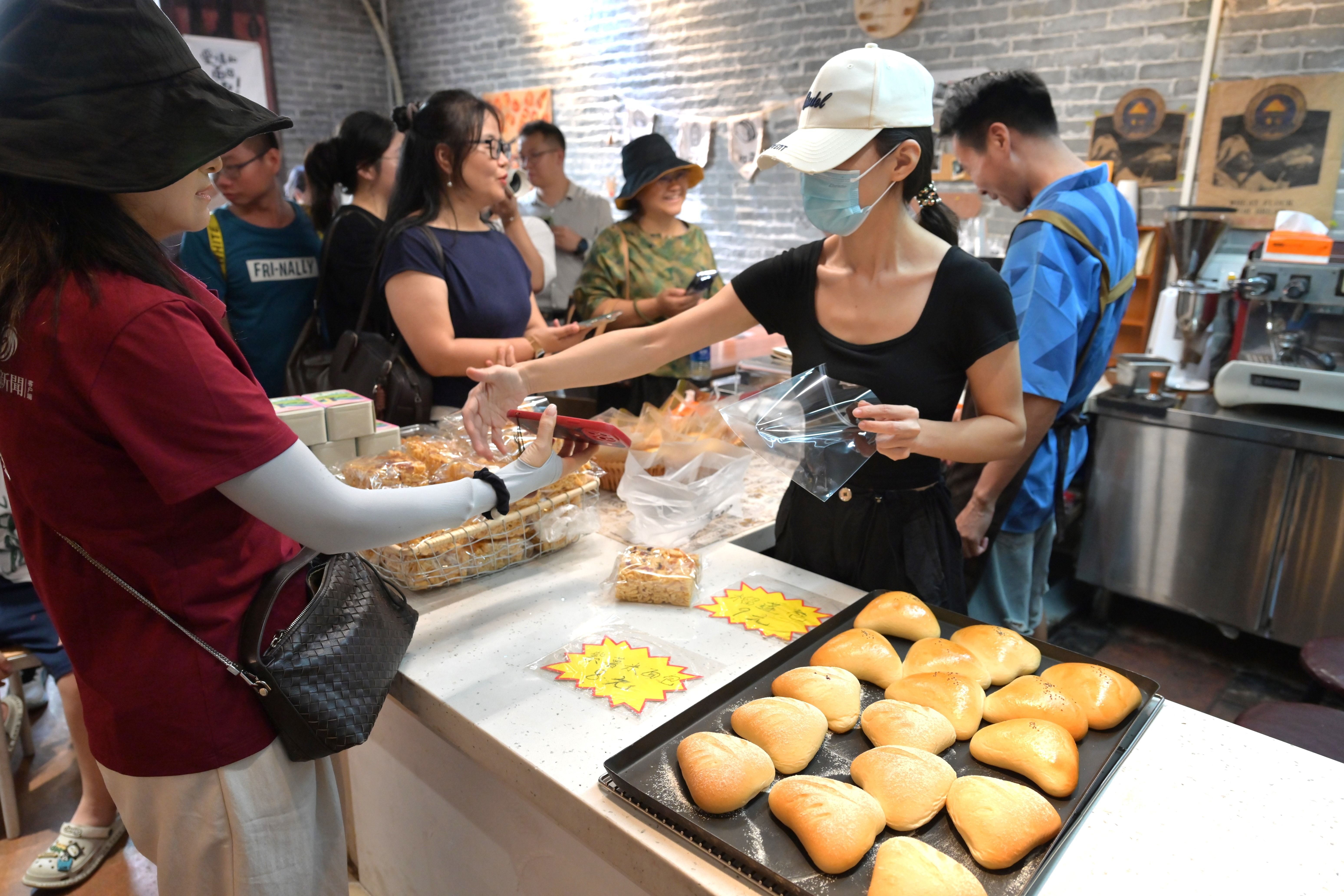 在南朗左步,哈喽窑烤面包的主理人林紫恩是邓长征的“高徒”之一。“以前上学时就梦想有一家店,一杯咖啡、一个面包,和朋友聊聊天。”今年5月,经过在曹边一段时间的跟班学习,林紫恩来到左步村开了自己的店。国庆期间,哈喽窑烤面包创下了一天最高数千元营业额的佳绩。