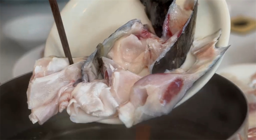 餐厅里的主角,是来自贵州清水江的野生大头鱼。此鱼生于长江流域清水江畔,云贵高原深山之中,远离污染,以天然浮游生物为食,生长周期长达3至4年,远长于普通塘鱼。漫长的生长时光,赋予它紧实厚重的肉质,最大可达三四十斤,鱼肉雪白,毫无泥腥味。