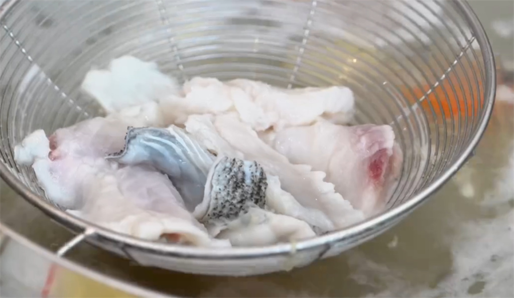 招牌清水鱼火锅,只用姜丝与土榨花生油加少许海盐即可入口。鱼片入沸汤涮煮5秒即熟,雪白细嫩,清鲜回甘。