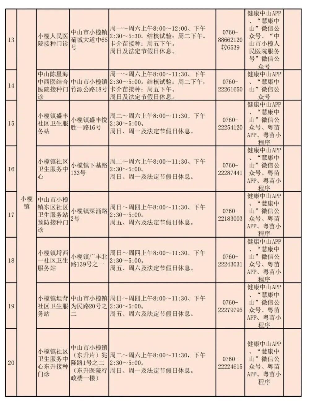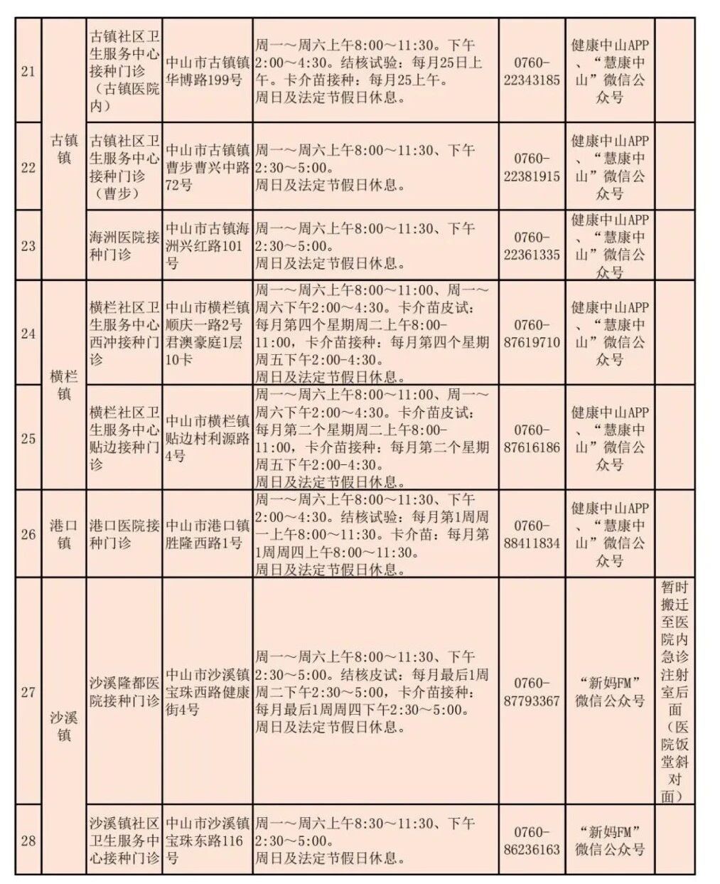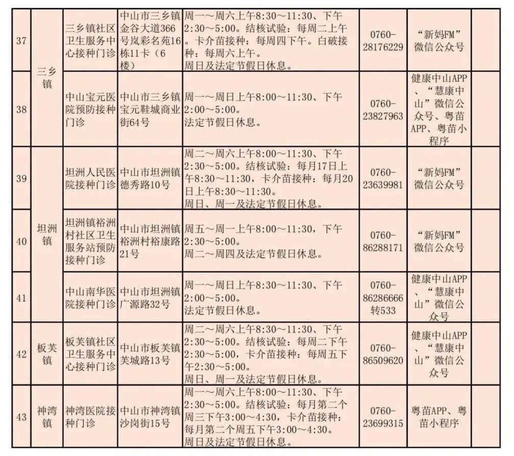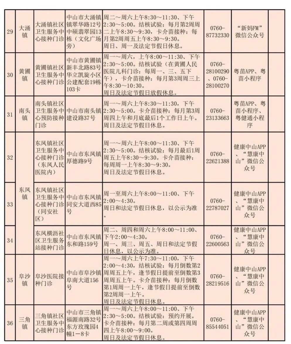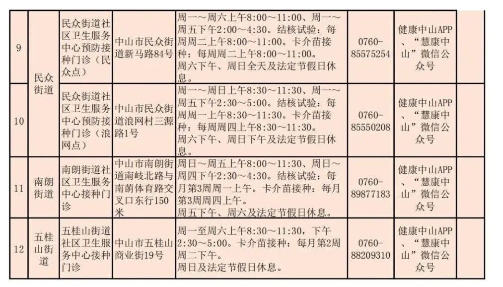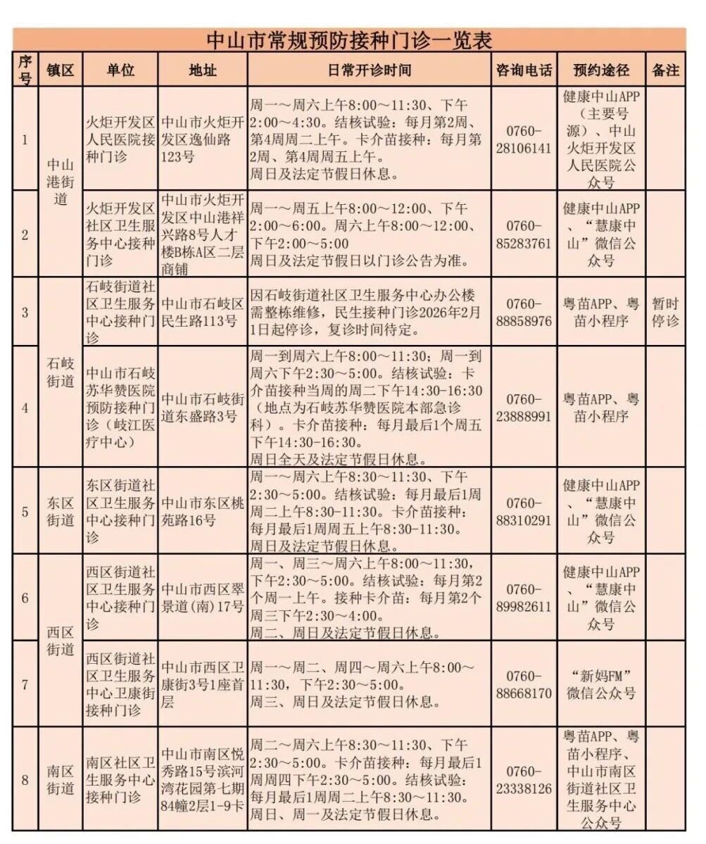 中山市常规预防接种门诊一览表如下: