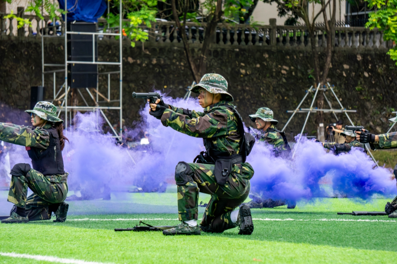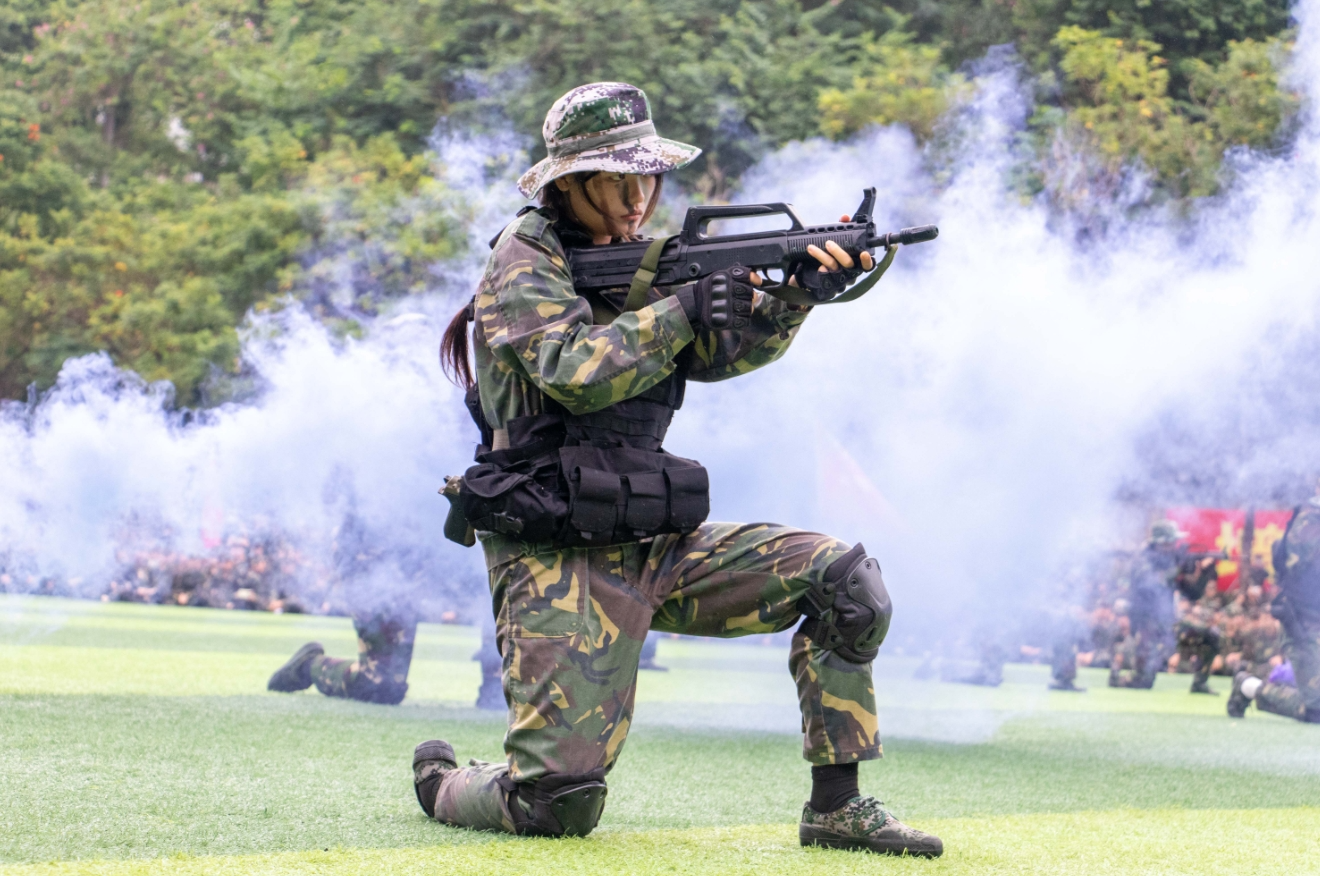 现场,由100多名新生组成的战术方队汇报,更是模拟实战场景,根据情节推进,在“战场”的硝烟四起中,展现行进间鱼跃翻滚、行进前转身仰姿狙枪、前滚进、侧滚卧倒等动作,一招一式尽显坚韧和勇敢。