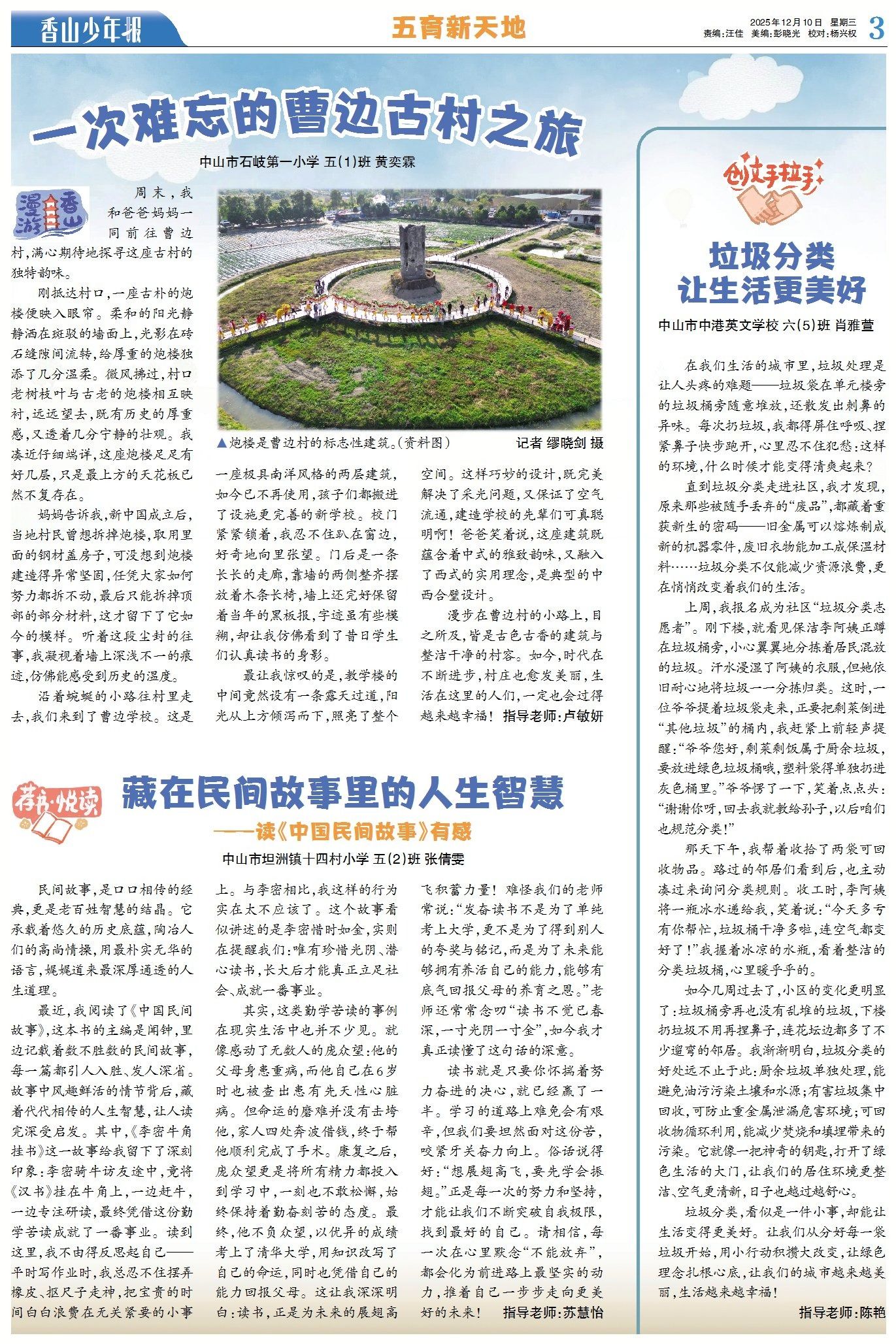 本期《五育新天地》,有同学通过文字生动捕捉了曹边村的历史韵味与独特景致;有同学分享读完《中国民间故事》后,领悟到要珍惜光阴、潜心读书的重要性;也有同学分享成为小区志愿者,引导居民垃圾分类的经历,呼吁大家从点滴做起,共建美好家园。(→点击查看详情)