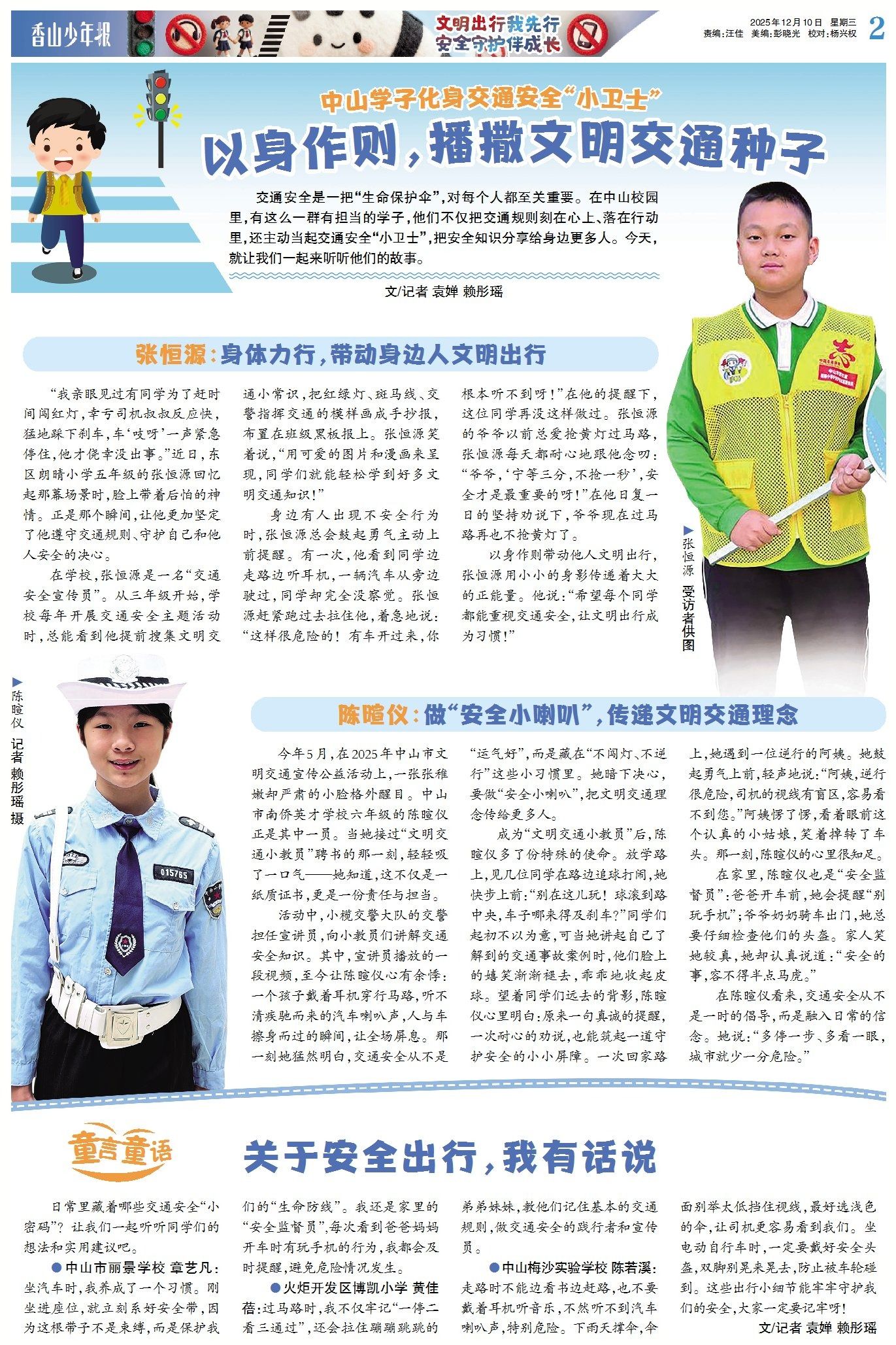 交通安全是一把“生命保护伞”,对每个人都至关重要。在中山校园里,有这么一群有担当的学子,他们不仅把交通规则刻在心上、落在行动里,还主动当起交通安全“小卫士”,把安全知识分享给身边更多人。今天,就让我们一起来听听他们的故事。(→点击查看详情)
