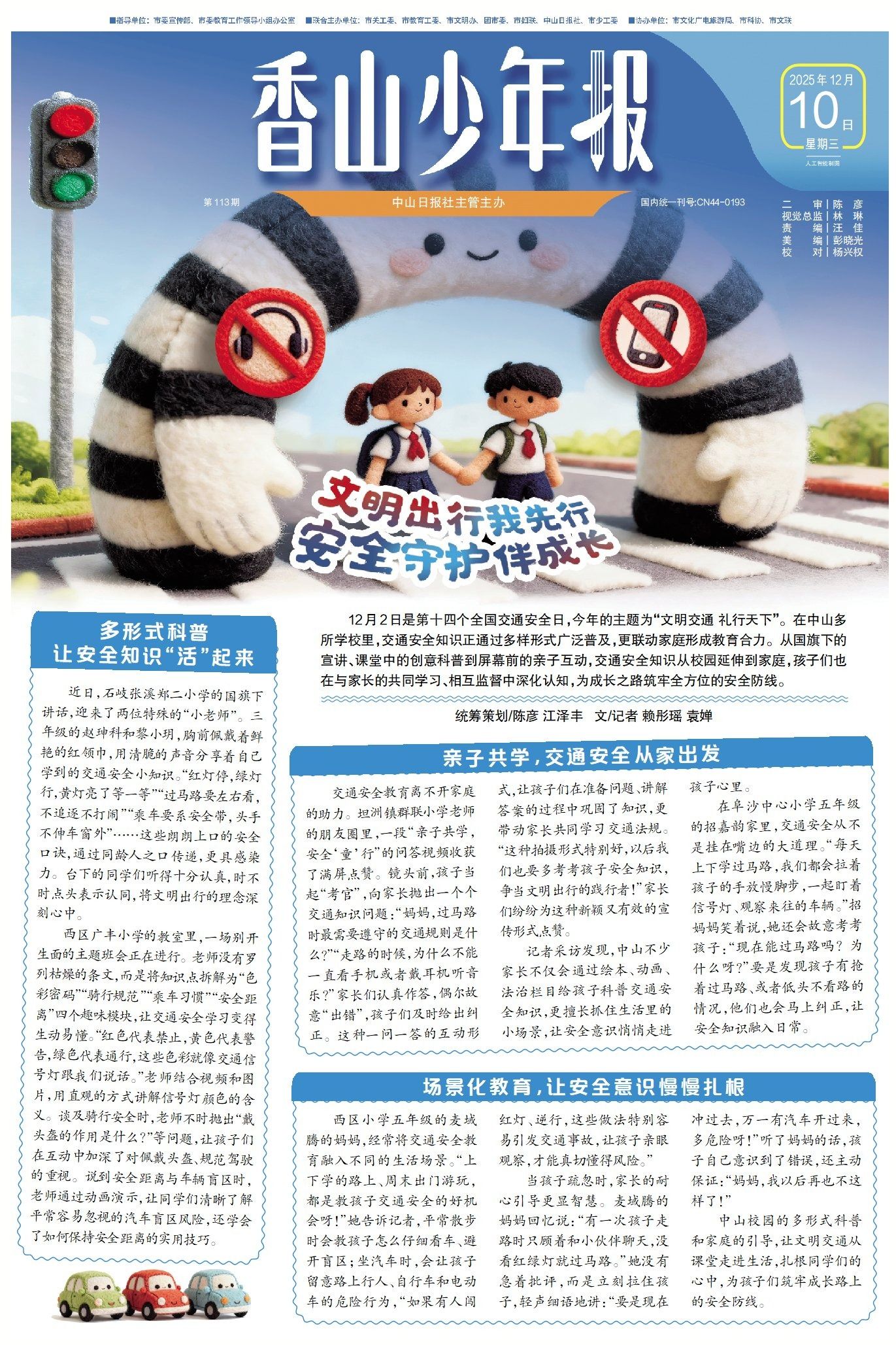 在中山多所学校里,交通安全知识正通过多样形式广泛普及,更联动家庭形成教育合力。从国旗下的宣讲、课堂中的创意科普到屏幕前的亲子互动,交通安全知识从校园延伸到家庭,孩子们也在与家长的共同学习、相互监督中深化认知,为成长之路筑牢全方位的安全防线。(→点击查看详情)