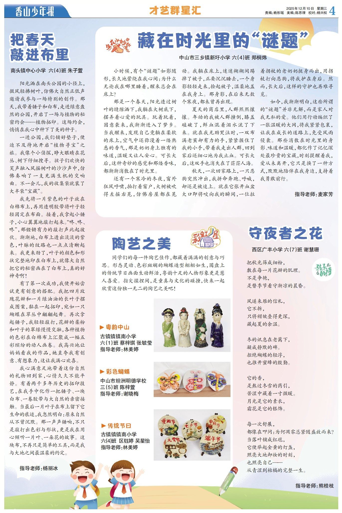 本期《才艺群星汇》,既有少年们的奇思妙想,更有藏在生活里的温柔与热爱。有同学以植物拓印留住自然肌理,在指尖触感中种下美的种子;有同学解开心中 “谜题”,发现家人的无私守护,早已为自己撑起一片无雨晴空;孩子的笔下,花朵走过四季流转,每一段时光都藏着诗意;彩虹屋里,同学们的陶艺佳作更是巧思满溢,指尖揉捏间碰撞出童真与文化的火花。(→点击查看详情)
