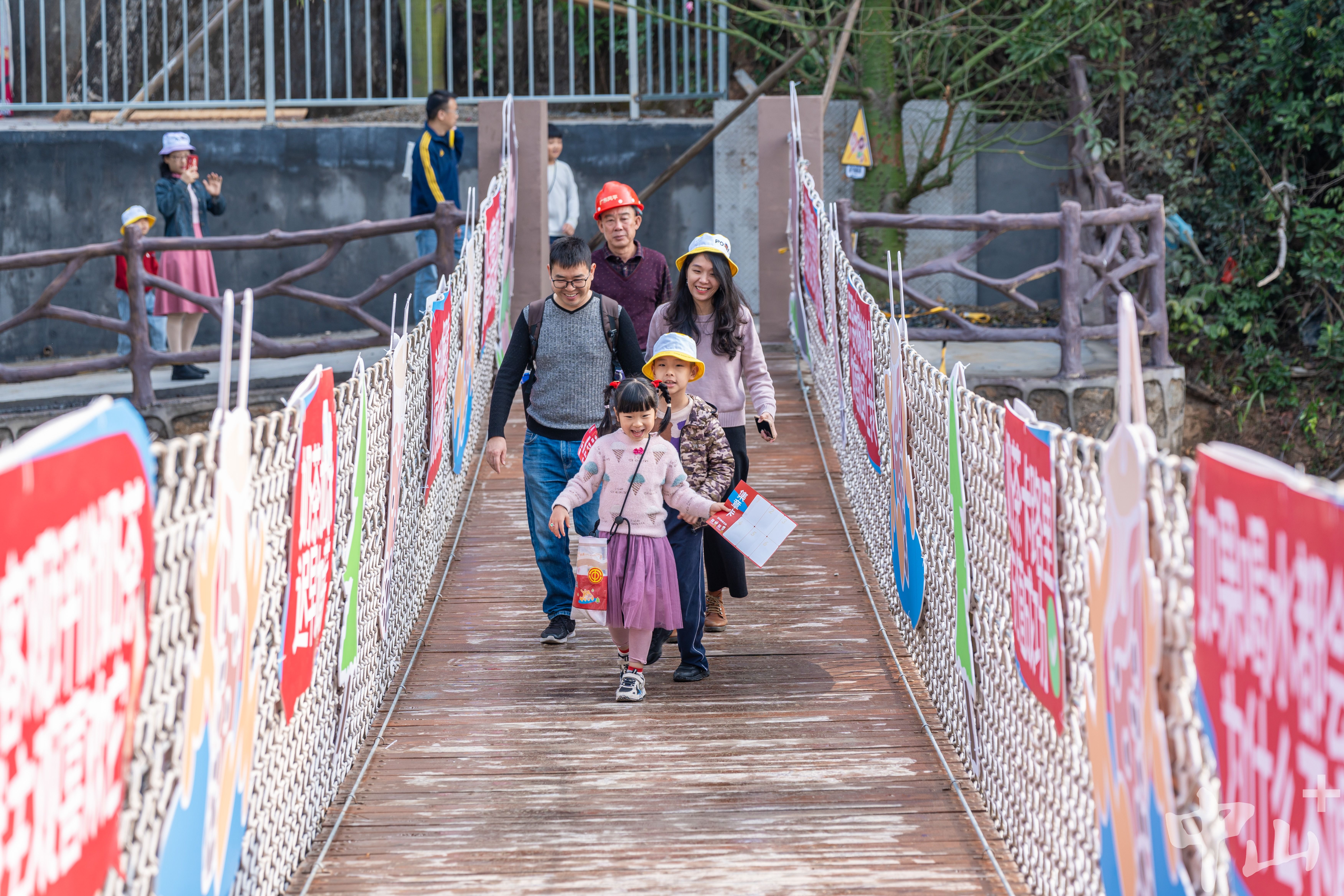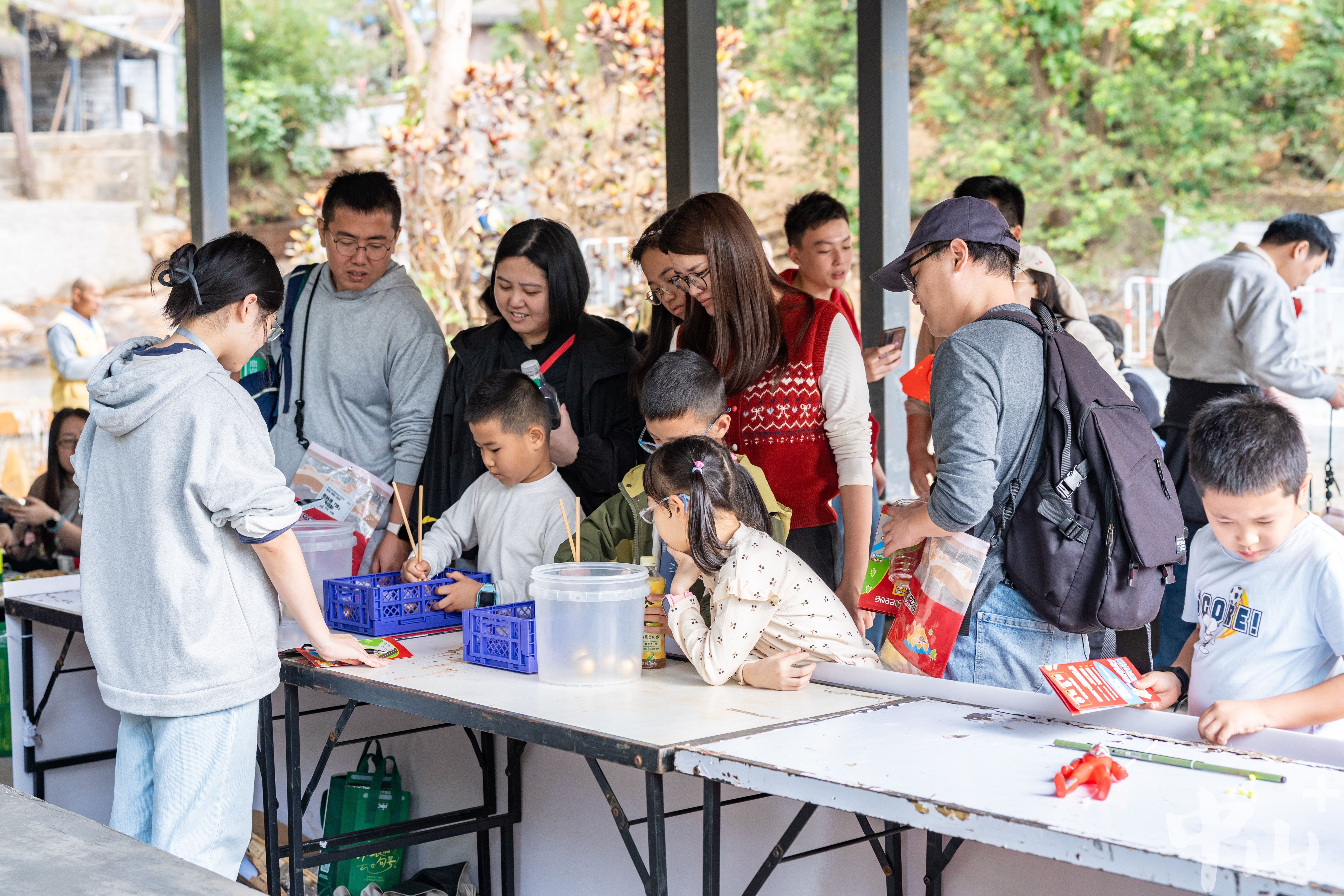 “寻宝启程”“嬉戏闯关”“秘境打卡”三条平行趣味主线成为活动核心亮点。在林间小道上,大人小孩手持藏宝图仔细搜寻。游园挑战区内,四项经典小游戏人气爆棚,游客们踊跃参与收集珍珠币,欢声笑语漫山遍野。来自深圳的游客杨小姐,带着家人在非遗展示区体验印画,两个可爱的女儿,正在认真地给醒狮上色。而沿固定“打卡点”组成的“隐藏路线”上,大家纷纷驻足拍照,将碧水青山与新年笑颜定格成最美风景。在国画体验区,62岁的范阿姨对记者说:“今天祖孙三代人一起来游玩,五桂山空气好,活动又丰富,体验感很好。”