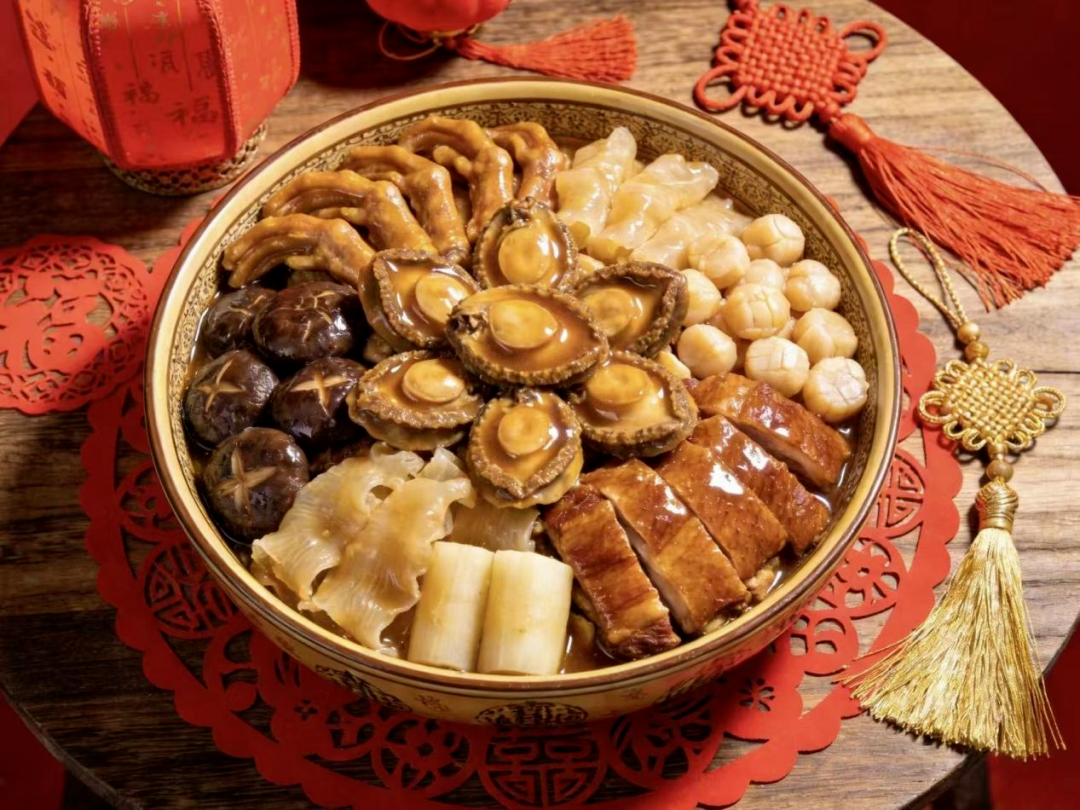盆菜则是年味的集大成者。鲍鱼、海参、花胶与广府靓汤交融,层层叠出“盆满钵满”的吉庆寓意。与之相呼应的,还有中山乳鸽的鲜嫩、清远鸡的紧实、脆肉鲩的弹润、罗氏沼虾的鲜美乃至清甜的可食用菊花,无不诉说岭南物产的丰饶。