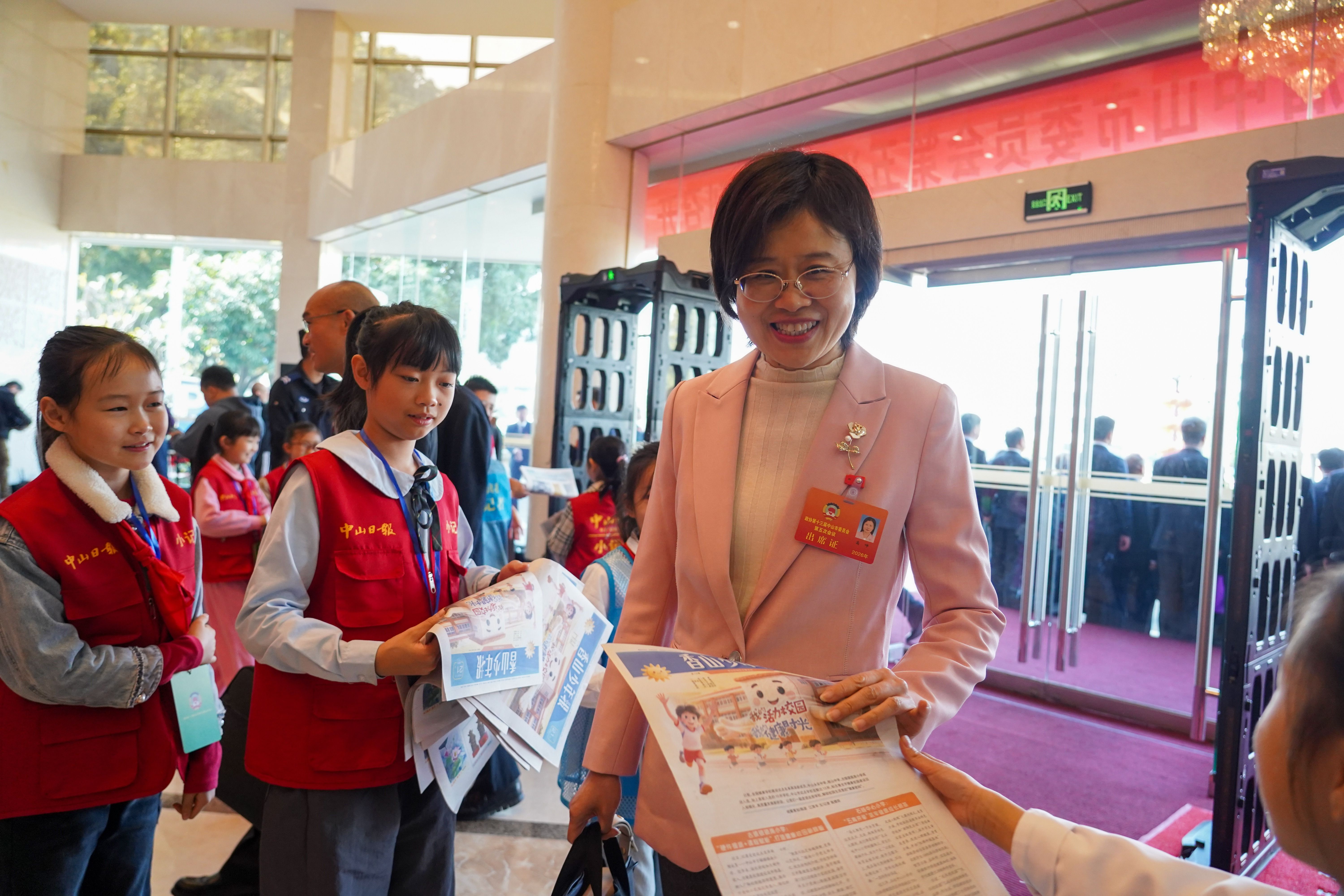 在会议正式开幕前,小记者们在市会议中心入口处热情地迎接政协委员们,并向他们派发《香山少年报》。