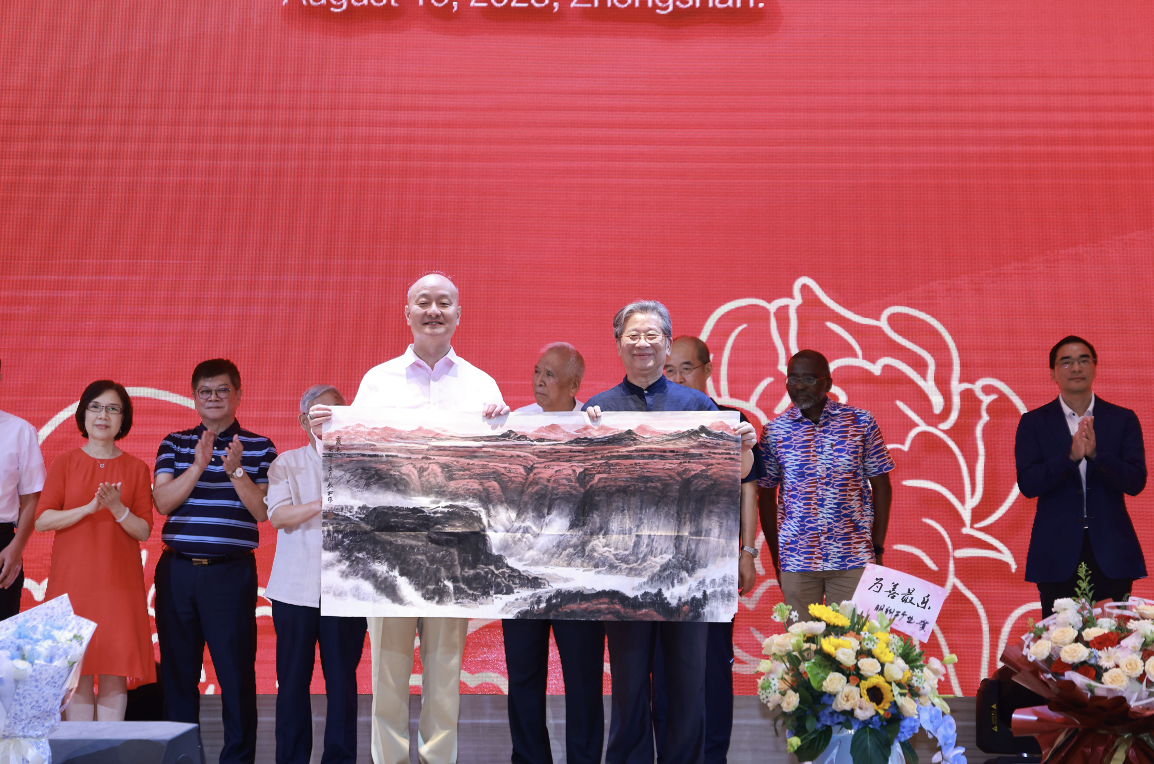 同时,远道而来的林毅也在现场向胡智荣致赠他的代表作北京奥运会开闭幕式大型纪念画册《无与伦比的盛典》以及《伟大征程-庆祝中国共产党成立100周年大型情景史施纪念画册》。广东省国际文化交流中心副理事长、原中国美协副主席、广东省文联主席、广东省美协主席许钦松、广东省书法家协会主席张桂光两位艺术家分别向胡智荣博士送上各自的国画作品、书法作品。