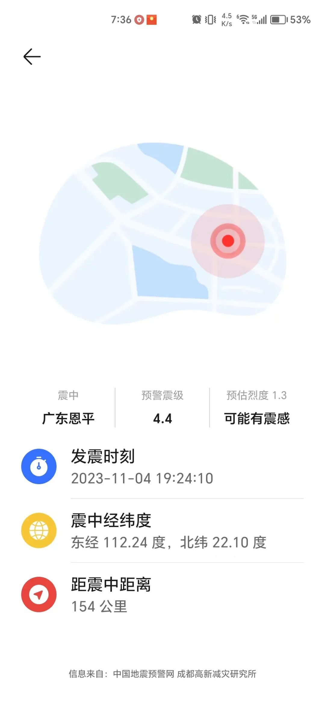 中国地震台网正式测定:11月04日19时24分在广东省江门市恩平市(北纬22.08度,东经112.25度)发生4.3级地震,震源深度8千米。