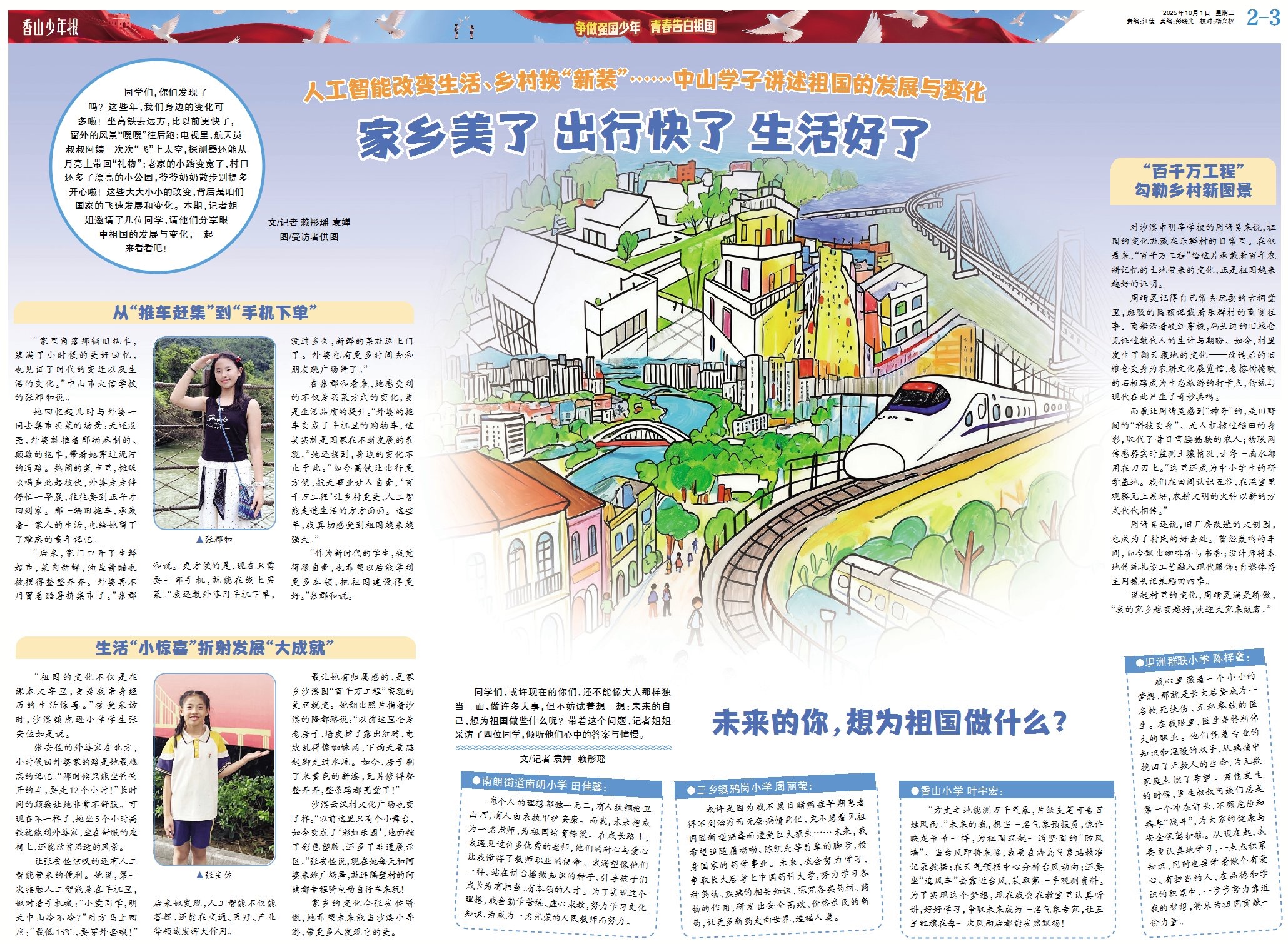 同学们,你们发现了吗?这些年,我们身边的变化可多啦!坐高铁去远方,比以前更快了,窗外的风景“嗖嗖”往后跑;老家的小路变宽了,村口还多了漂亮的小公园。这些大大小小的改变,背后是咱们国家的飞速发展和变化。同学们分享了眼中祖国的发展变化,以及自己对未来的憧憬。→点击查看详情