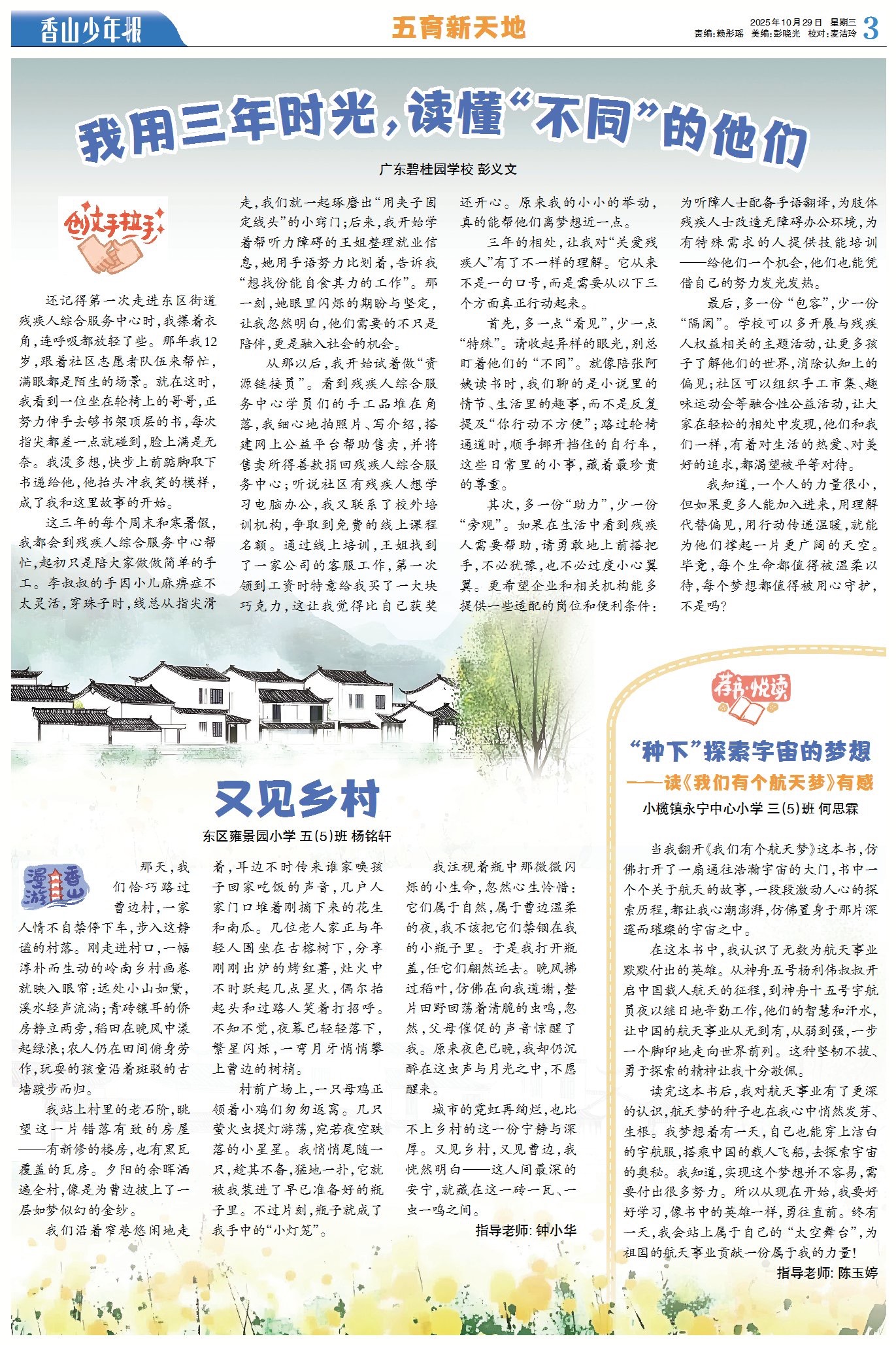 本期《五育新天地》,有同学分享了在残疾人综合活动中心参与志愿服务的难忘经历;也有同学写下游览南区曹边村的鲜活见闻,还有同学畅谈阅读感悟,航天主题书籍在心中种下逐梦苍穹的种子,激荡起少年壮志。(→点击查看详情)