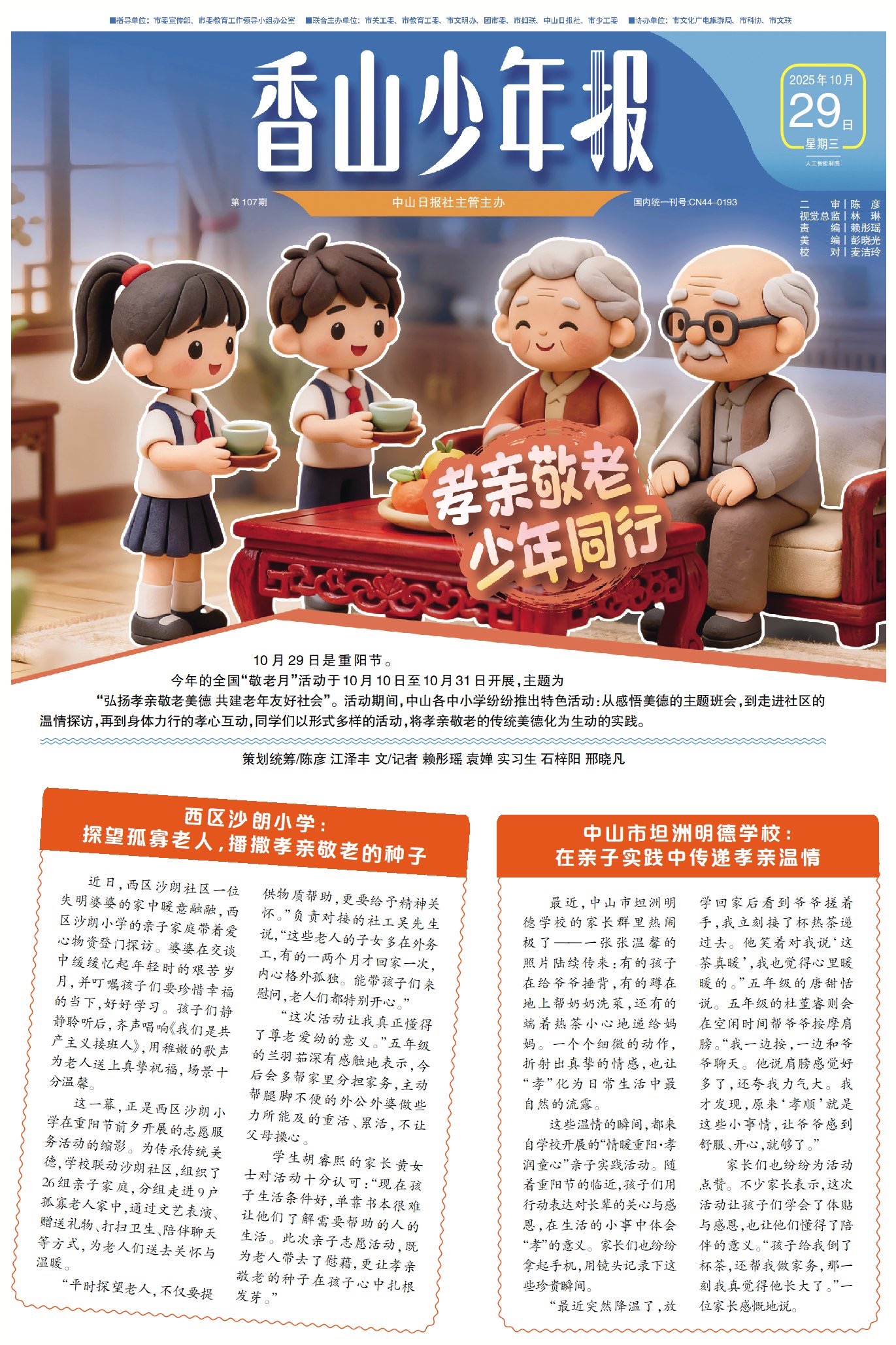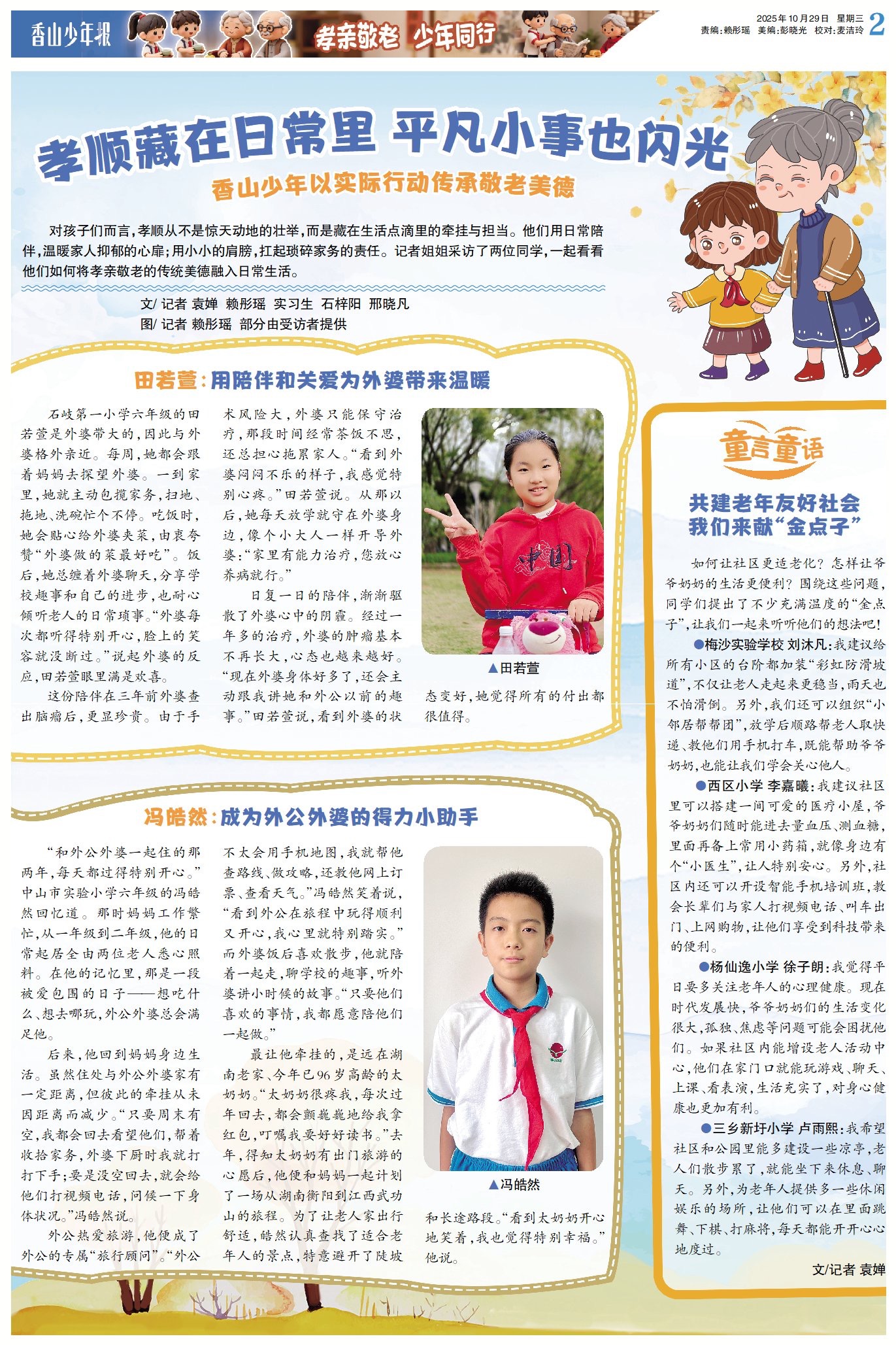对孩子们而言,孝顺从不是惊天动地的壮举,而是藏在生活点滴里的牵挂与担当。他们用日常陪伴,温暖家人抑郁的心扉;用小小的肩膀,扛起琐碎家务的责任。记者姐姐采访了两位同学,一起看看他们如何将孝亲敬老的传统美德融入日常生活。(→点击查看详情)