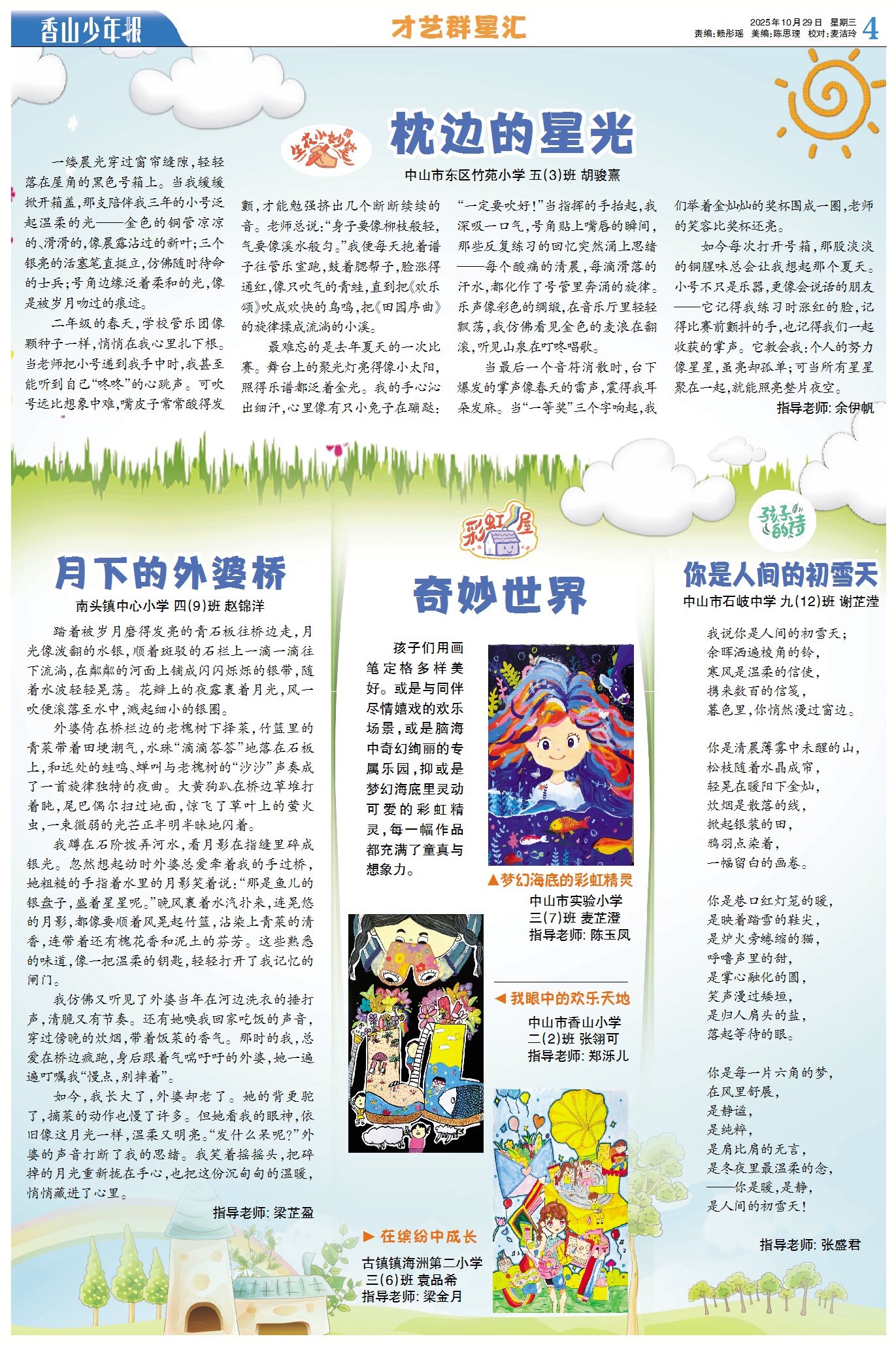 本期《才艺群星汇》,有学子分享了校园管乐团的逐梦时光,吹号角的点点滴滴藏着执着与热爱;月下外婆桥的剪影与外婆的儿时往事,细腻又动人。孩子的诗将冬日与初雪赋予鲜活生命,字句间满是诗意与灵气。彩虹屋更是童趣盎然,每一幅作品都盛满纯粹童真,绽放无限想象力。(→点击查看详情)