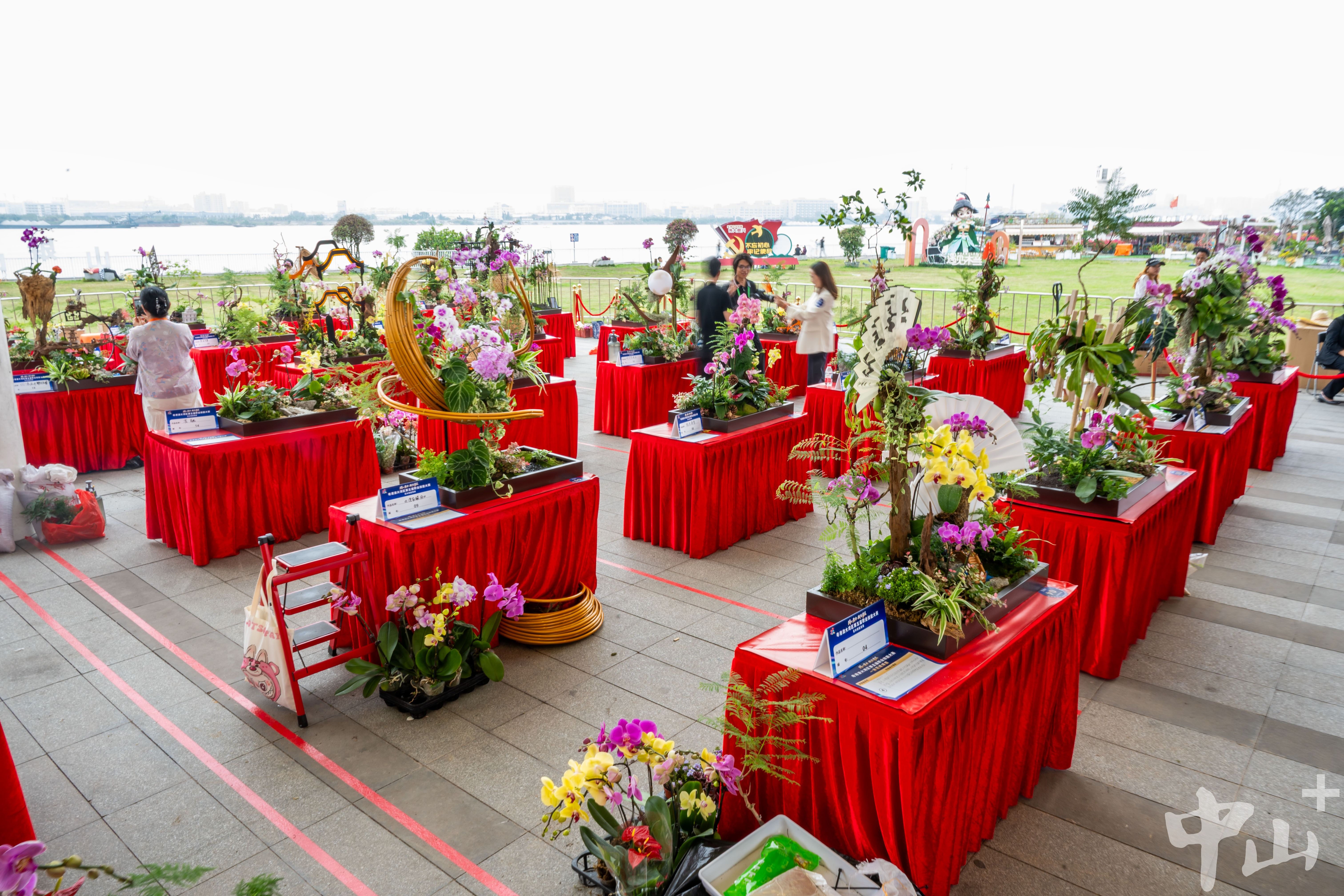 澳门工联总会参赛选手、澳门美高梅花艺员黎贤俊从业十多年,他以竹木搭建出立体架构,用蝴蝶兰、红掌等花材营造丰富色彩,并以圆球灯饰象征明月,底部以蓝布、石块模拟水系,共同构成一幅“明月照湾区”画卷。首次来此参赛的黎贤俊表示:“中山的花材种类很丰富,与各地选手交流,也让我拓展了创作思路,收获很大。”