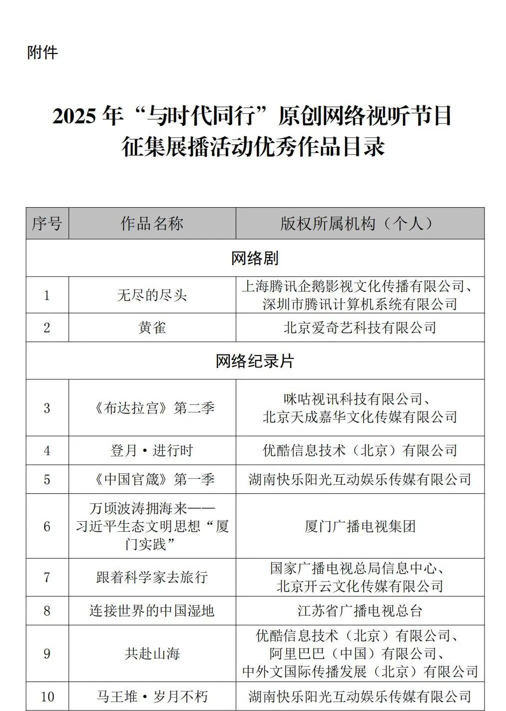 11月18日,国家广播电视总局公布2025年“与时代同行”原创网络视听节目推选结果。经各省级广电行政部门和有关中央单位、高校推荐,广电总局组织专家进行多轮评审,最终确定140部优秀网络视听节目入选。