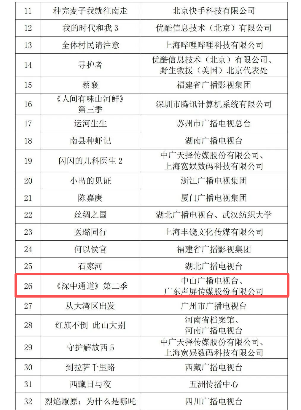 其中,由中共中山市委宣传部、中山广播电视台和深中通道管理中心联合摄制,广东声屏传媒股份有限公司承制的纪录片《深中通道 第二季》榜上有名!