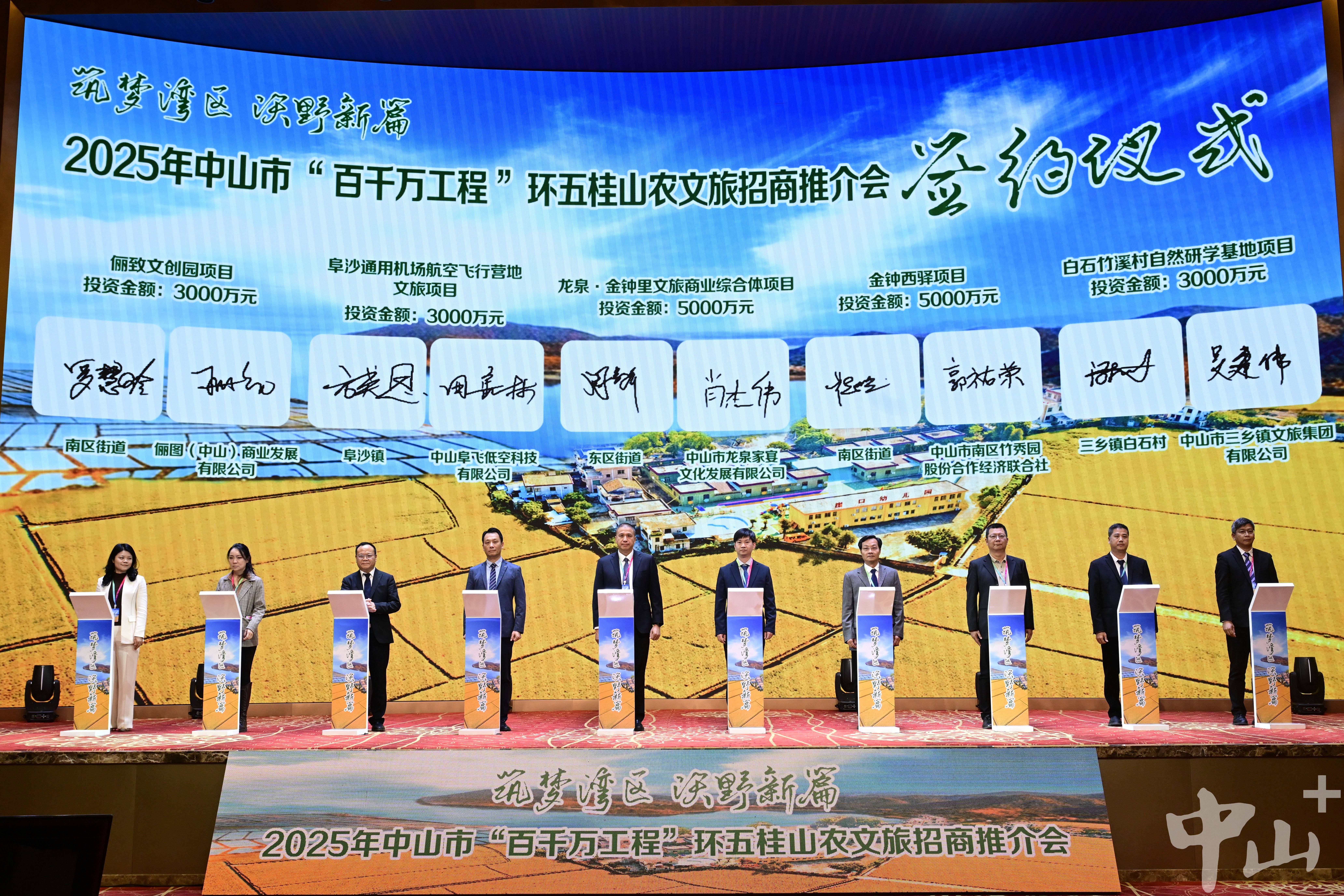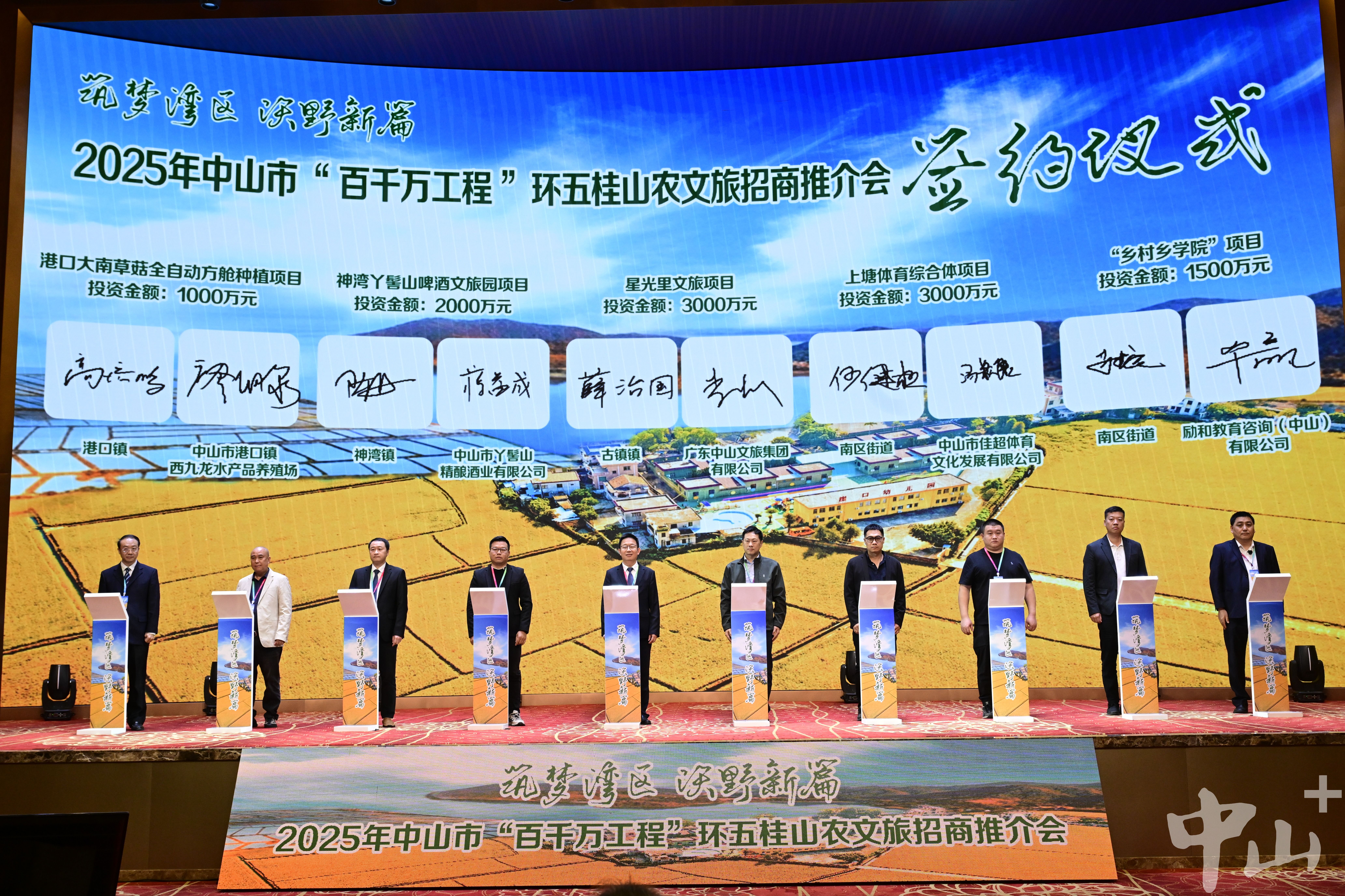 12月18日下午,“筑梦湾区 沃野新篇”2025年中山市“百千万工程”环五桂山农文旅招商推介会在中山温泉宾馆召开,来自全国各地的农业、文旅和投资方面企业精英齐聚一堂,共谋农文旅融合发展新路径,为中山农文旅产业高质量发展凝聚智慧与力量。活动现场签约19个优质项目,总投资额达28.42亿元,为中山农文旅产业高质量发展注入强劲动能。
