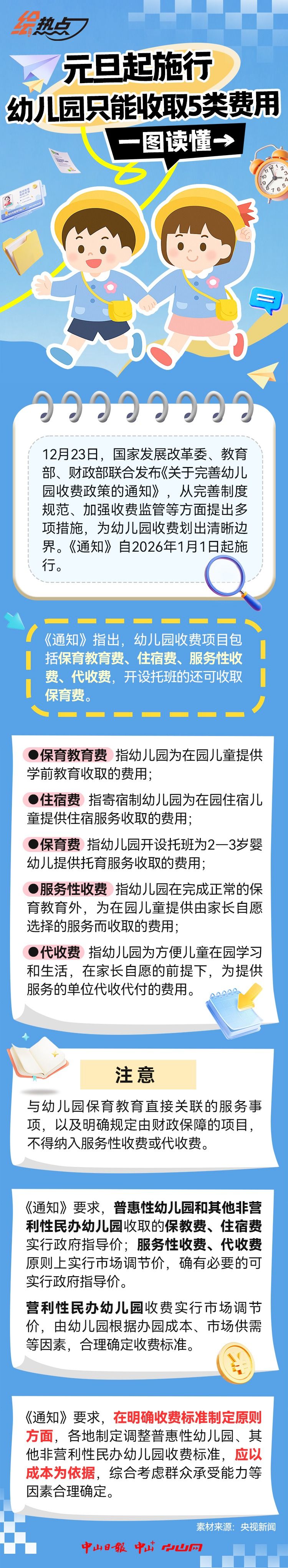 1223日,国家发展改革委、教育部、财政部联合发布《关于完善幼儿园收费政策的通知》,从完善制度规范、加强收费监管等方面提出项措施,为幼儿园收费划出清晰边界。《通知》自202611日起施行。