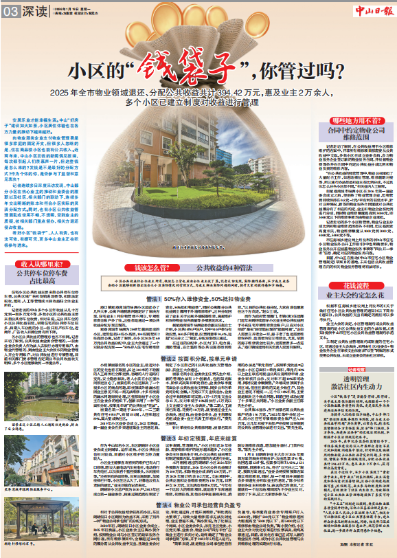 记者连续多日深度采访发现,中山部分小区在热心业主的推动和业委会的履职以及社区、相关部门的联动下,连续多年交出明晰的账本和符合小区实际的灵活分配方式。同时,也有小区公共收益管理混乱或使用不畅、不透明,受到业主的质疑,被相关部门重点督办,相关方退还侵占收益。