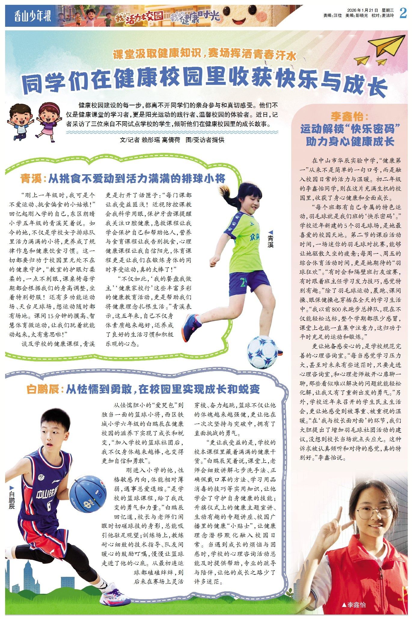 健康校园建设的每一步,都离不开同学们的亲身参与和真切感受。他们不仅是健康课堂的学习者,更是阳光运动的践行者、温馨校园的体验者。近日,记者采访了三位来自不同试点学校的学生,倾听他们在健康校园里的成长故事。(→点击查看详情)