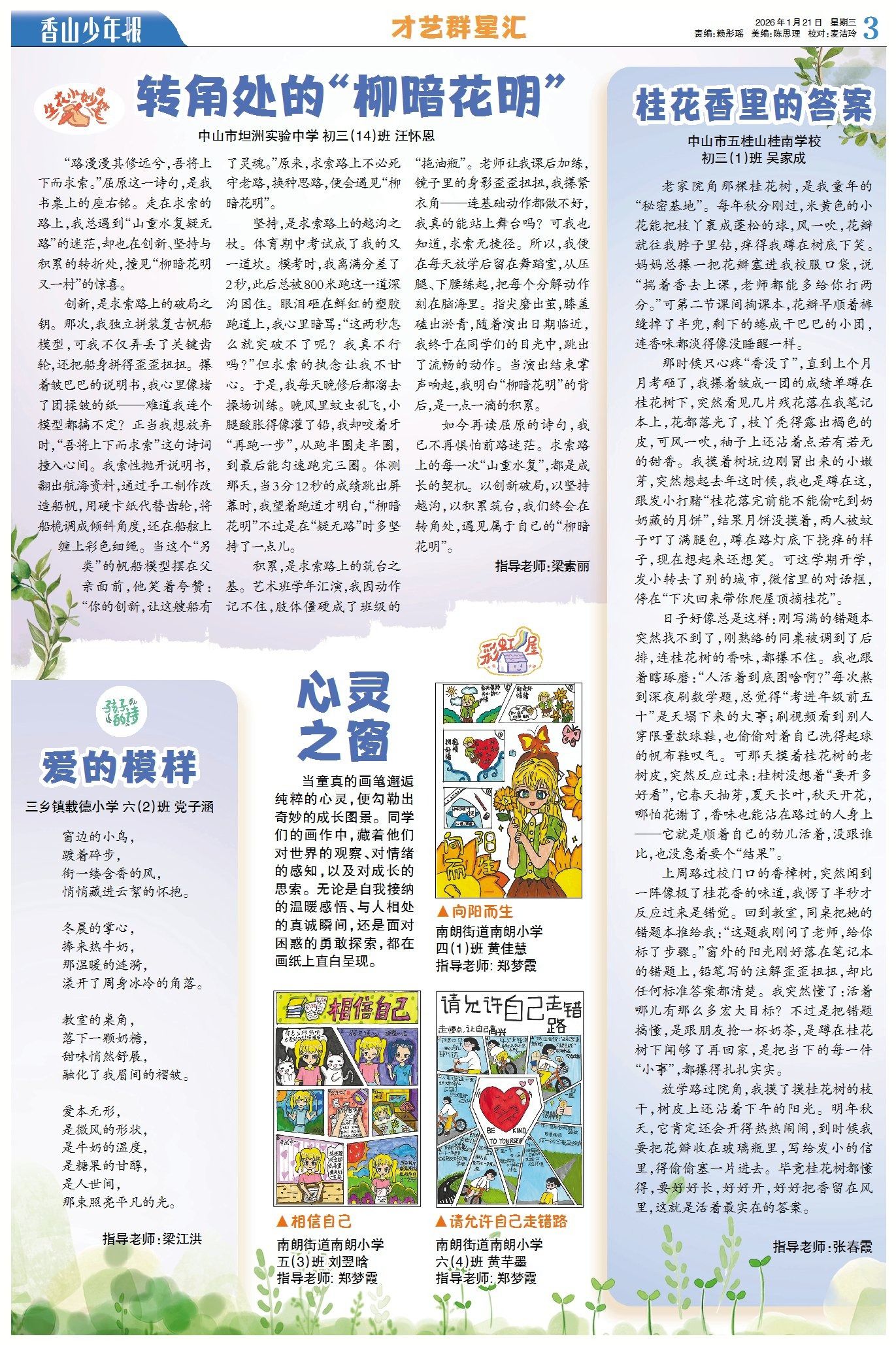 本期《才艺群星汇》,有同学从生活与学习的点滴经历里,读懂古人诗句传递的人生真谛;有同学分享了老家门前那株桂花树,留下了童年时光的难忘回忆;孩子的诗,则让我们触摸到爱的模样。在彩虹屋中,斑斓的色彩映照着少年们对世界的观察、对情绪的感知,以及对成长的思索。(→点击查看详情)