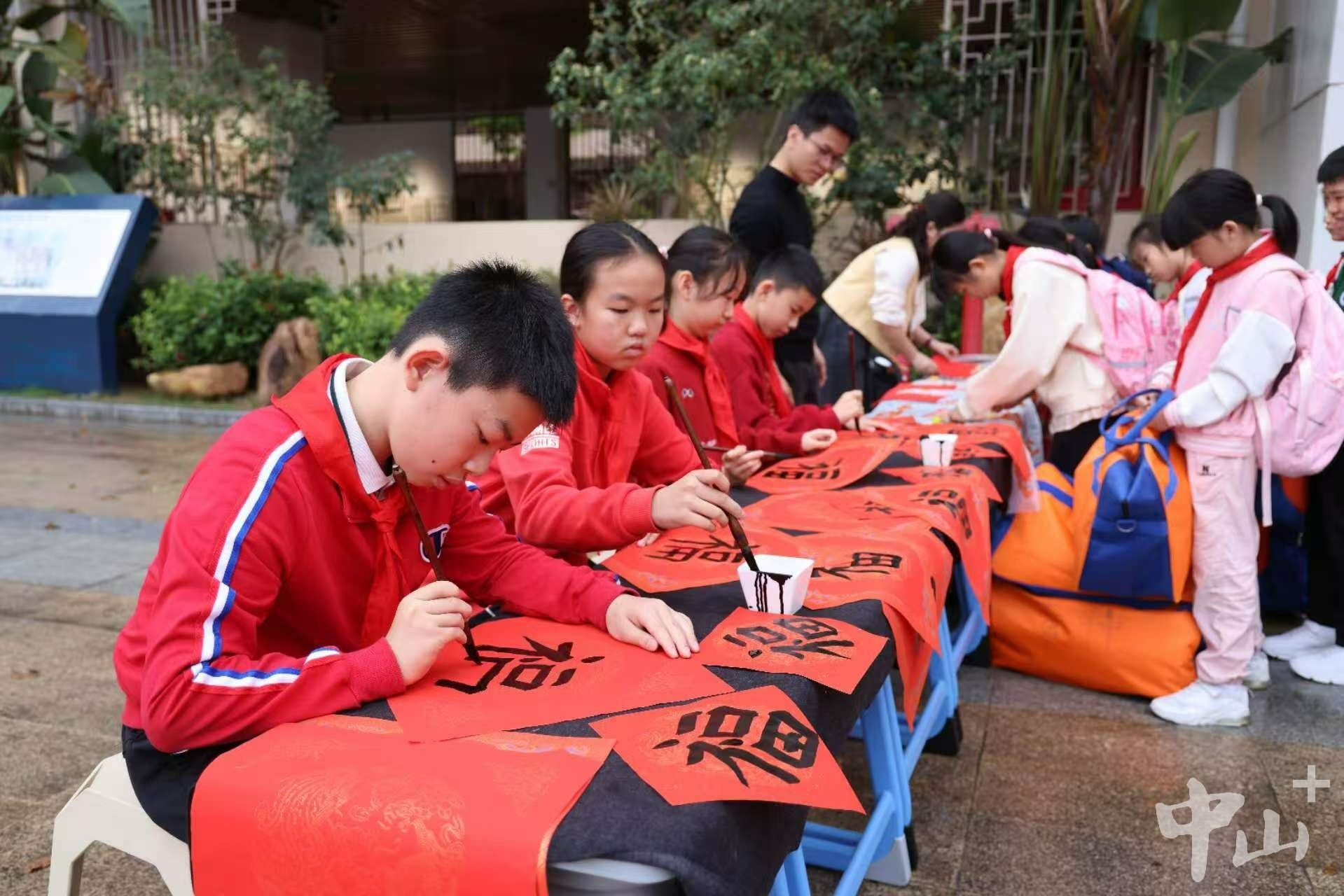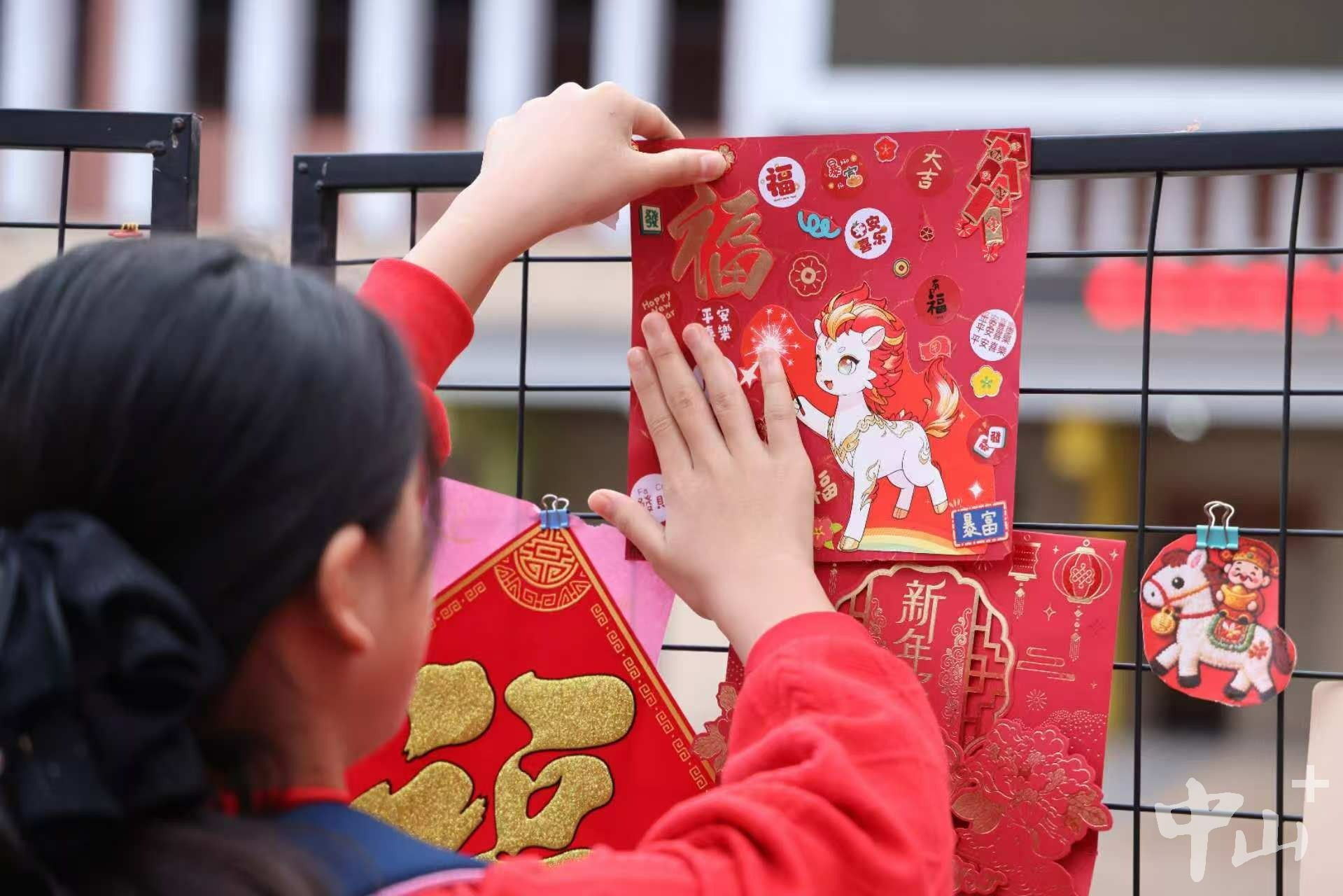 清晨7时30分,校园门口暖意融融。红色拱门矗立大门口,学校民乐团将表演现场搬到户外,奏响《步步高》,朝气满满的旋律回荡校园。一旁的集福墙上贴满同学们的手写祝福,书法校队的同学一字排开,现场挥毫泼墨为师生书写福字,同学们也纷纷将自己准备的“福”字贴上集福墙。行政老师们手持棒棒糖,微笑迎接每一位学生,整个校园满是欢声笑语。
