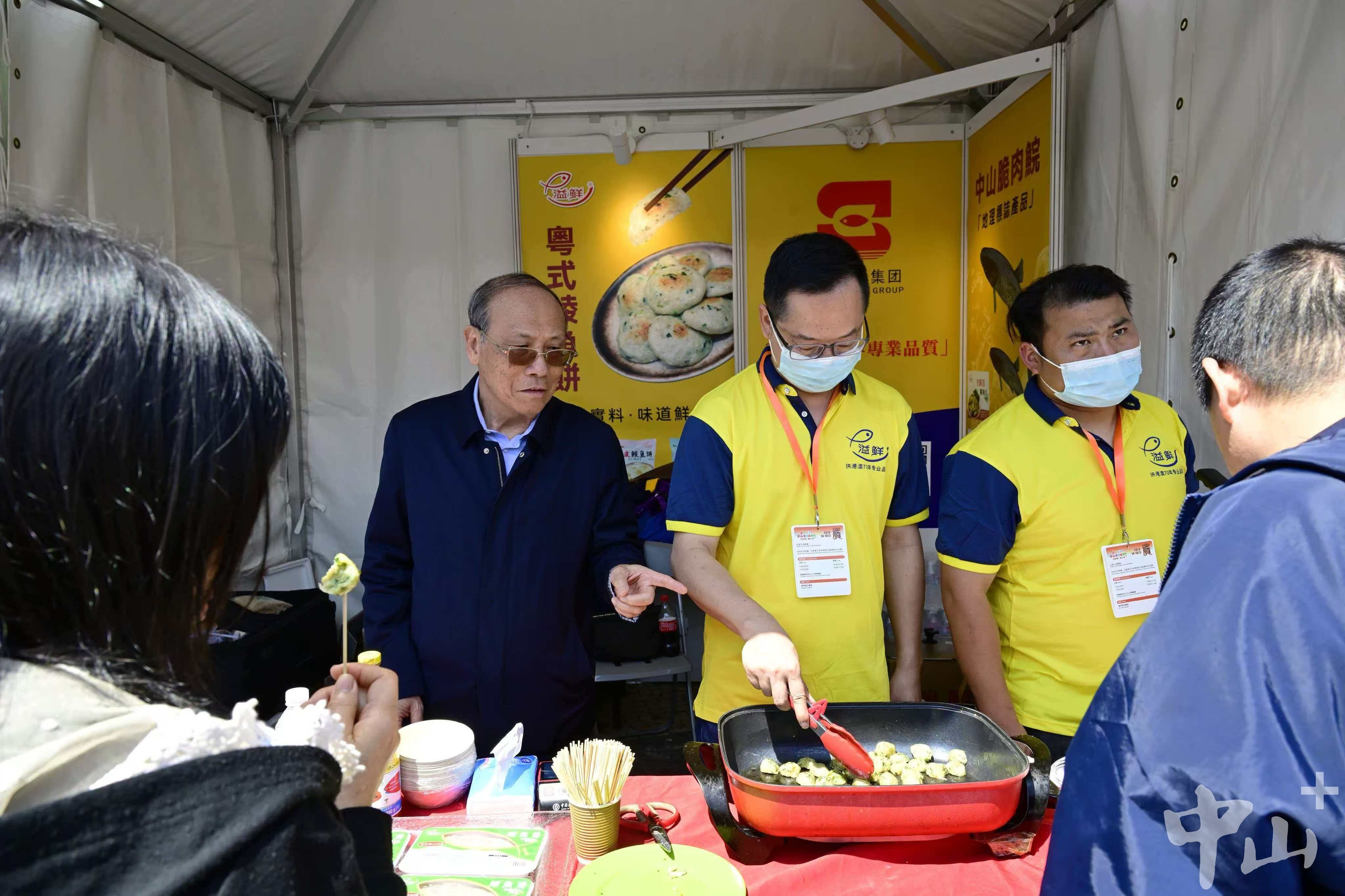 中山水出集团董事长何荣洪(左)在活动现场。本次活动中,中山水出集团的产品被受追捧,两天售出超2000公斤脆肉鲩。记者 余兆宇 摄
