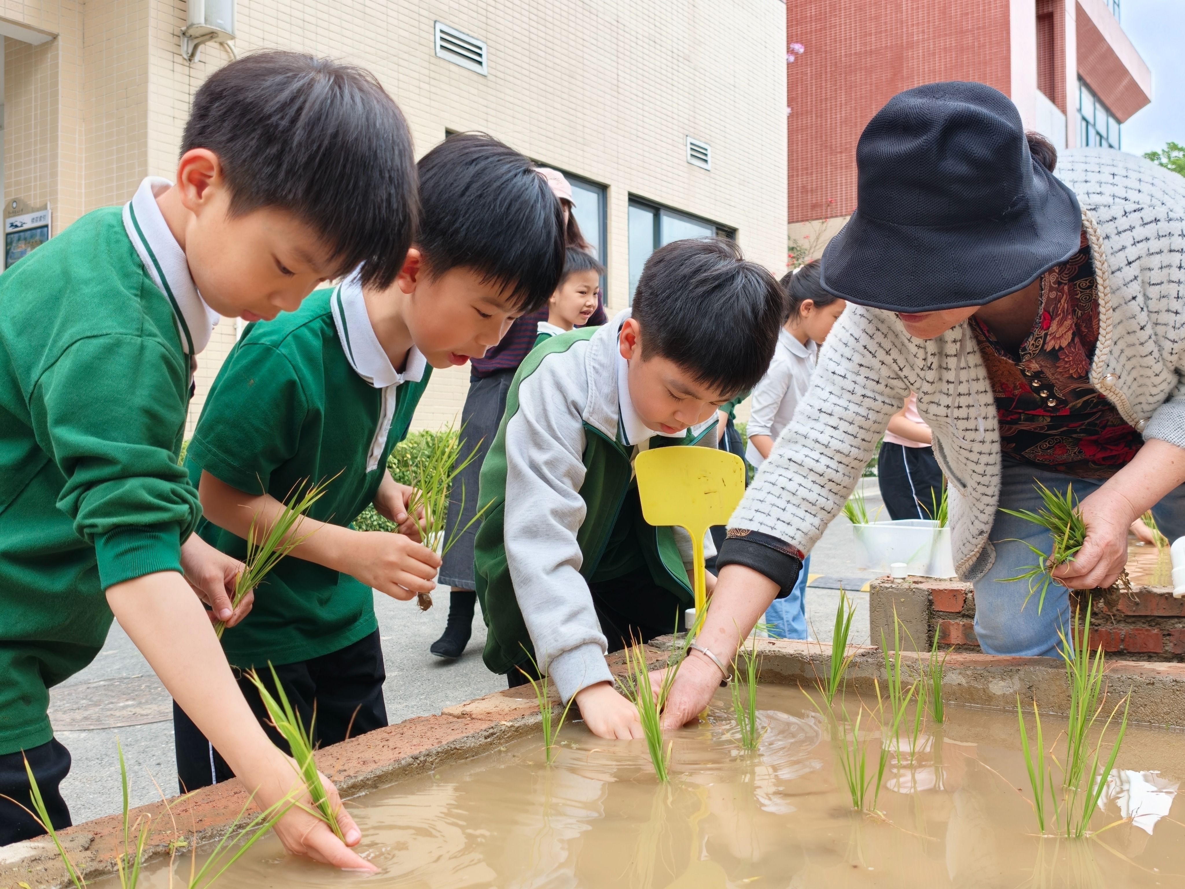走进香山小学校园种植基地,一派热闹又温馨的劳作场景映入眼帘。春日暖阳洒在嫩绿的秧苗上,一年级的同学们挽起衣袖,小心翼翼捧着秧苗,在老师的耐心指导下,认真地开启入插秧体验。孩子们神情专注,小手轻轻捏住秧苗根部,缓缓插入水田,动作从生疏逐渐变得熟练。同学们不怕脏、不怕累,有的弯腰细心栽种,有的互相帮忙传递秧苗,还有的轻声交流着刚学到的气象知识,稚嫩的脸庞写满认真与喜悦。汗水浸湿了额发,笑容却格外灿烂,一排排整齐的秧苗在孩子们的手中扎根田间,成为校园里一道动人的风景。