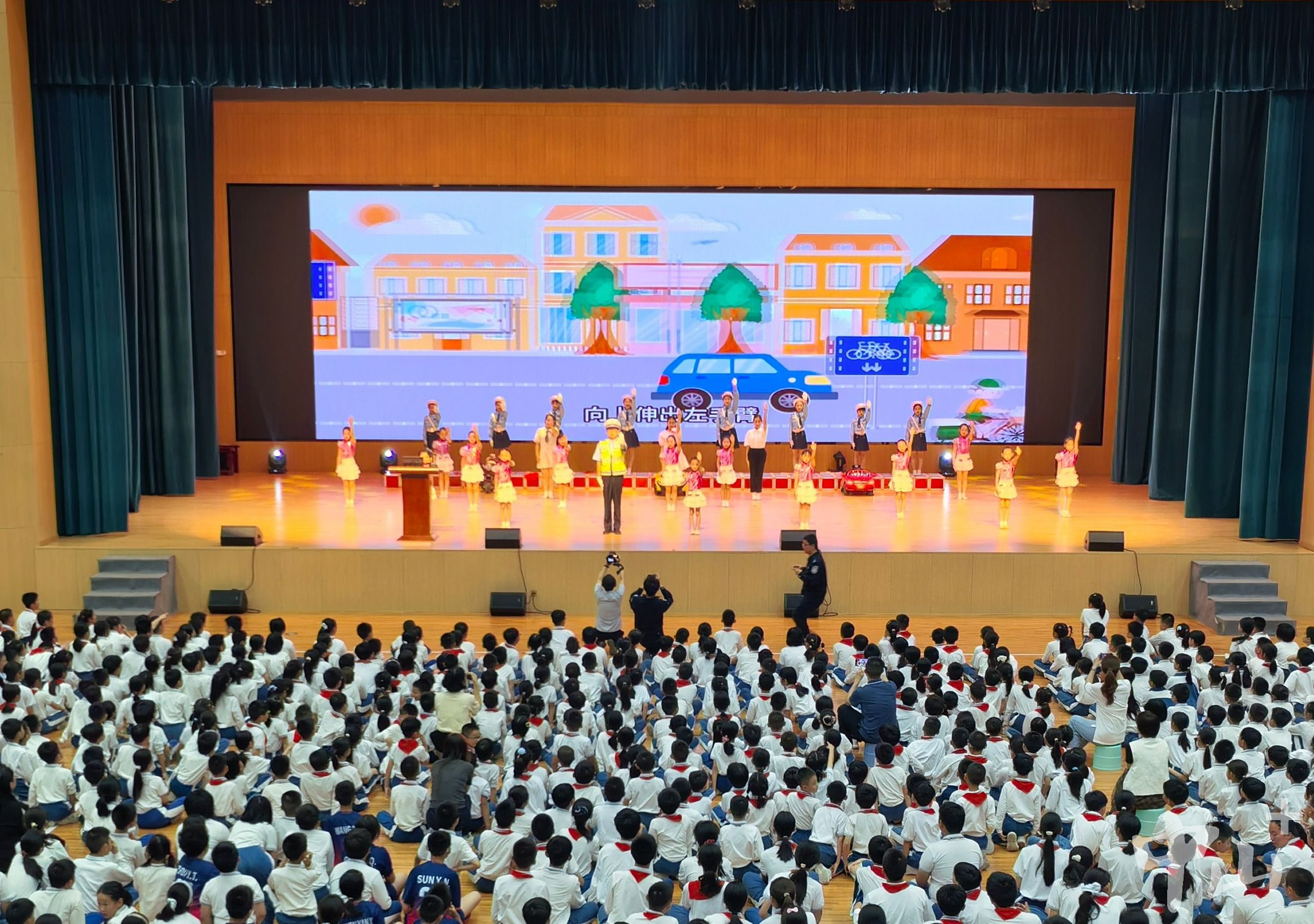 石岐中心小学校长黄伟祥介绍了学校交通安全管理的实践:建立家校警协同协管机制,每日上下学时段由家长义工、老师与交警共同维护校门口秩序,有效缓解拥堵现象;学校将交通安全教育纳入日常教学,每月开设一节安全课,通过情景剧、视频等形式强化学生交通安全意识;每学期邀请交警开展情境式教学,引导学生和家长遵守交通法规。