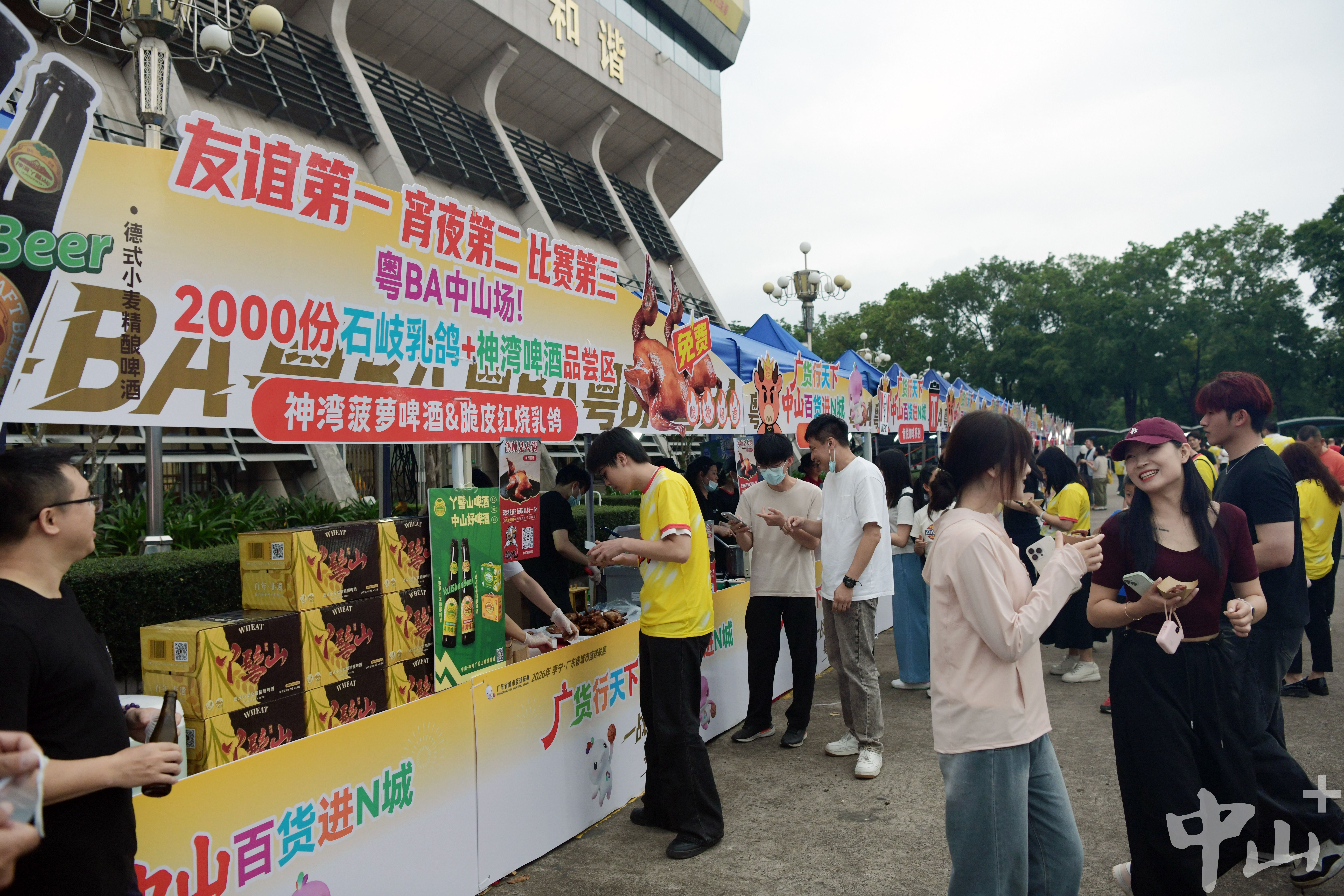 赛场内,第一节比赛正在紧张进行,球员每球必争、全力拼搏;赛场外,美食氛围同样火热,“广货行天下”的摊位上各式中山本土美食琳琅满目,石岐乳鸽、芦兜粽等特色小食香气四溢,让观赛多了一份城市烟火气。无论比分如何起伏,拉拉队队员和球迷始终以轻松自在的心态享受赛事,用美食传递热情,用包容展现风度,是独属于中山主场的一道风景。