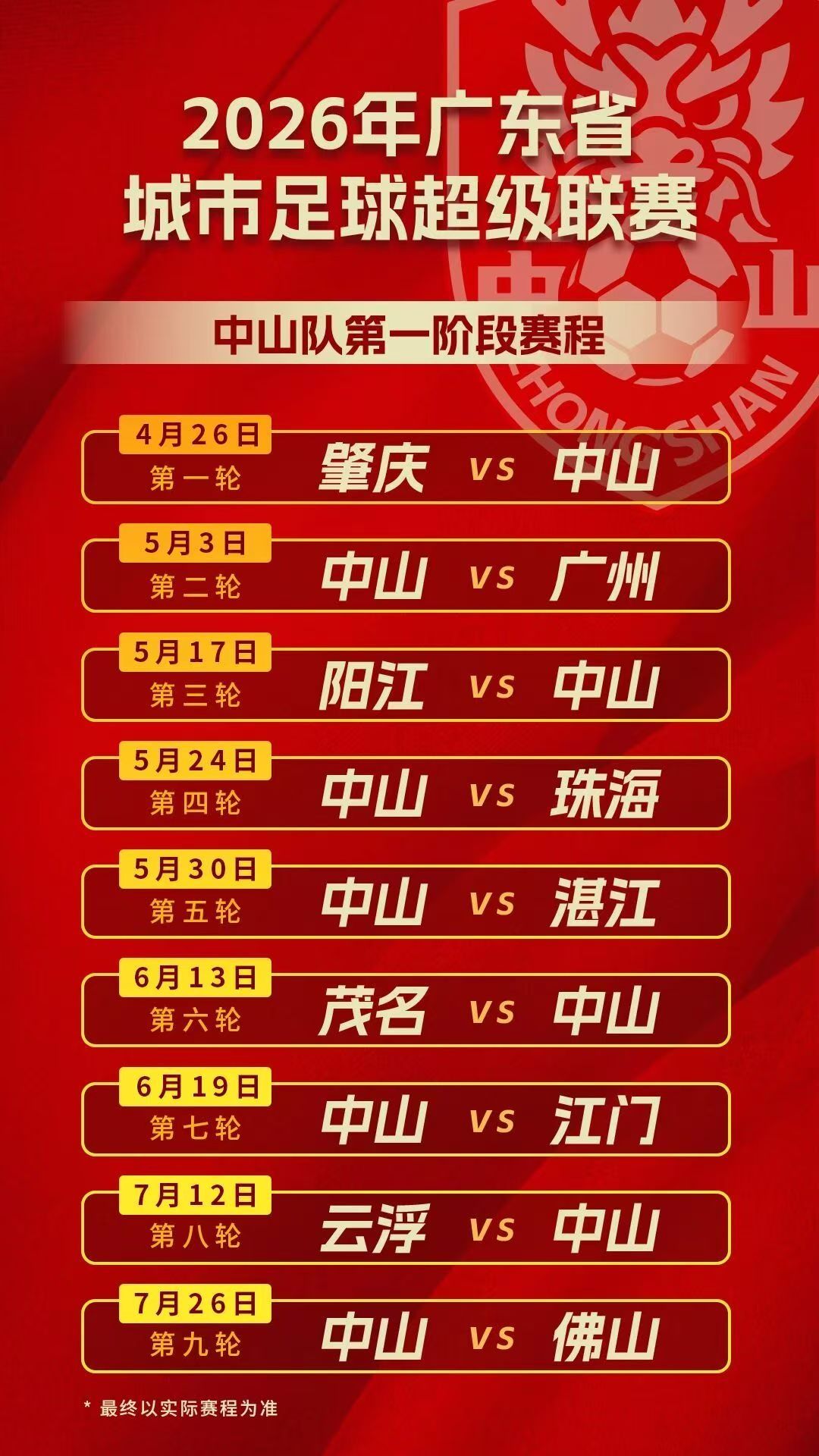 “粤超”赛程横跨劳动节、端午、中秋、国庆等多个重要节假日。根据组委会公布的赛程,中山队将于4月26日19:30在肇庆市新区体育中心专业足球场迎来本届“粤超”的首场比赛,客场挑战肇庆队。中山队常规赛主场设在中山市兴中体育场,将在此分别迎战广州队、珠海队、湛江队、江门队、佛山队。
