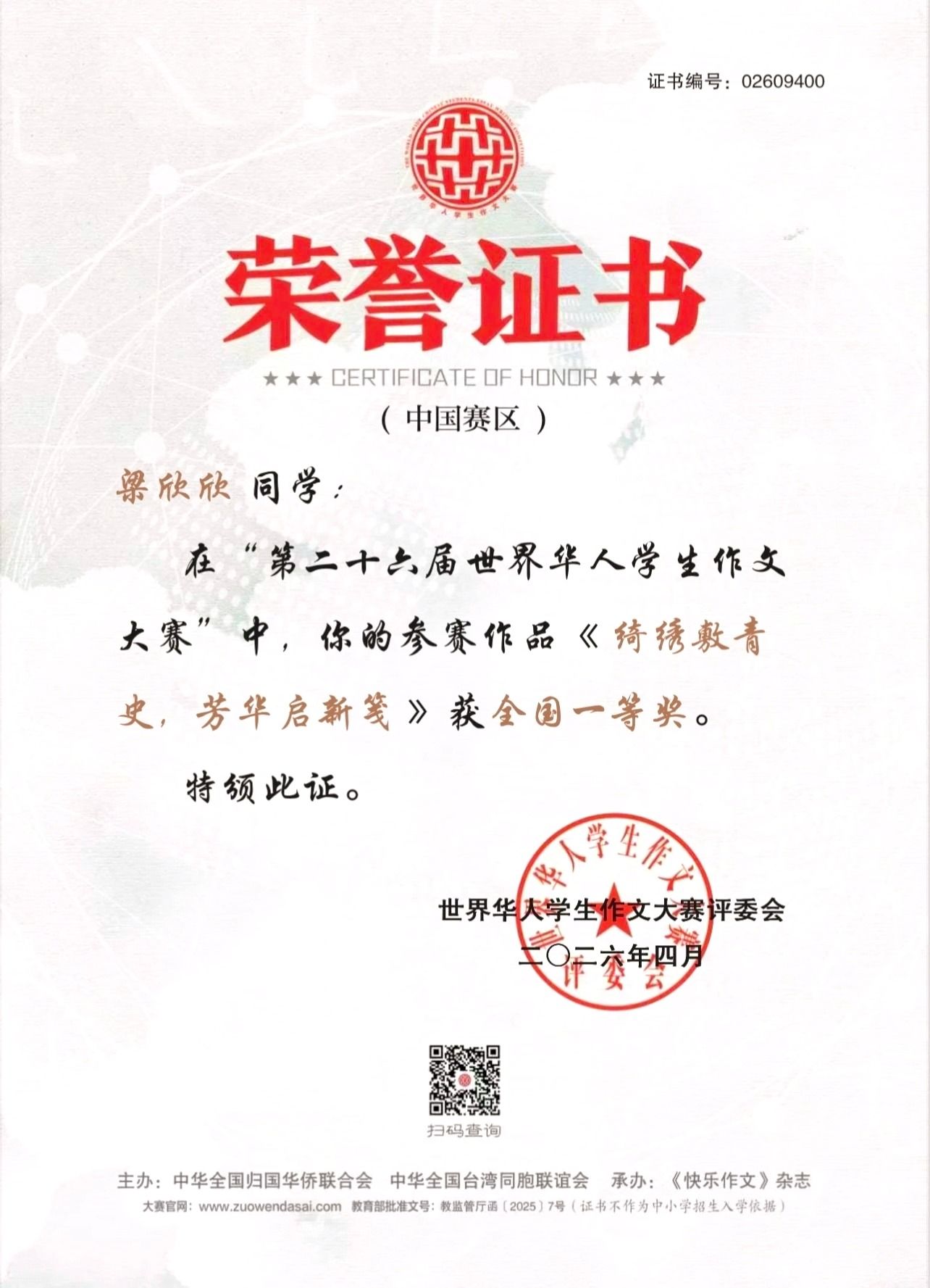 日前,第二十六届世界华人学生作文大赛获奖结果正式公布。中山市中山纪念中学高二(1)班学生梁欣欣凭借佳作《绮绣敷青史,芳华启新笺》,成功摘得全国一等奖,并入围全球前100名网上复赛,成为中山侨界学子在该项国际赛事中脱颖而出的优秀代表。
