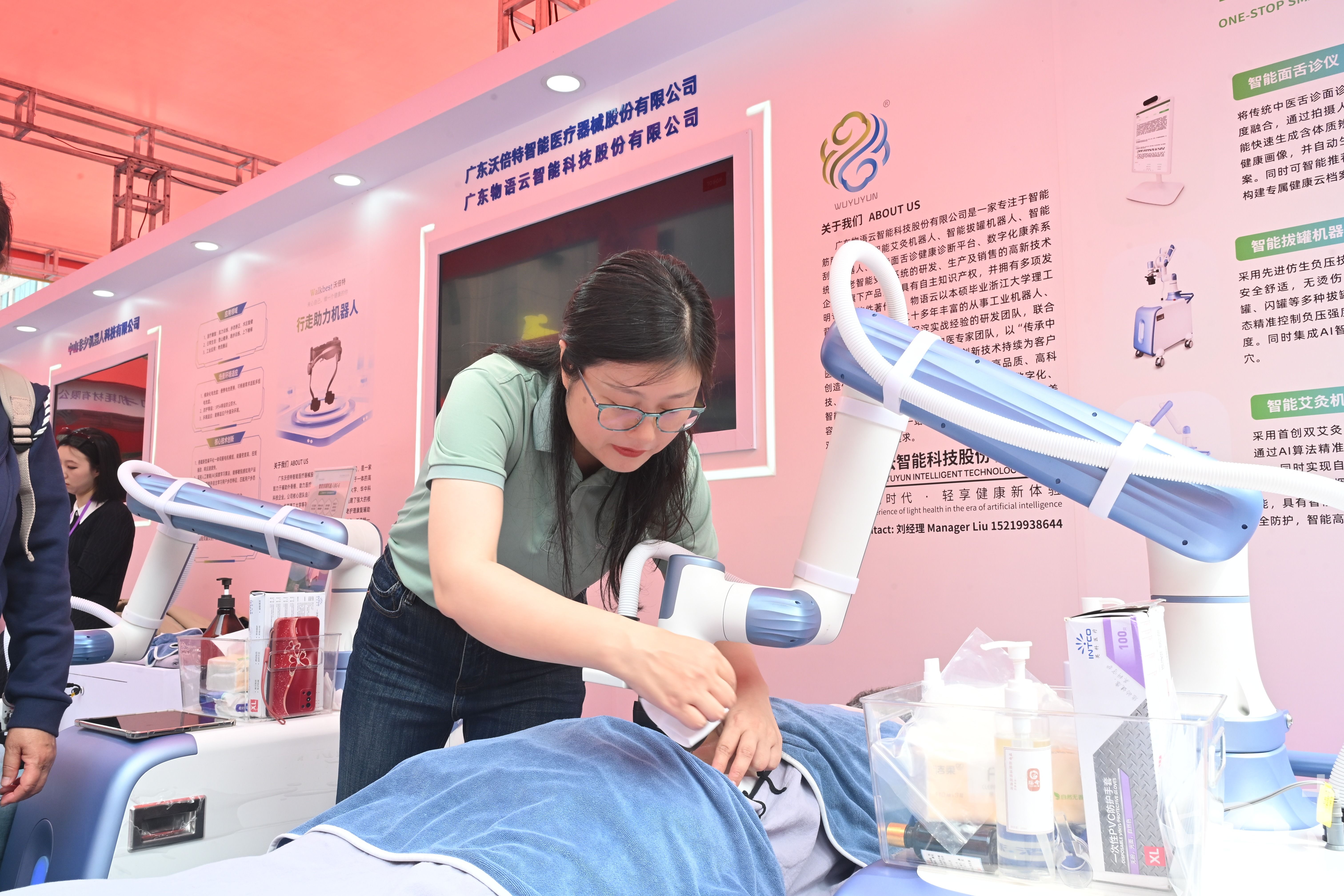物语云销售总监吴艳平介绍,企业专注研发生产智能中医机器人系列、数字化康养与安控系统,为康养行业提供一站式个性化方案。本次展会带来筋膜机器人、拔罐机器人等产品,让市民游客近距离感受“科技+中医”的创新魅力。