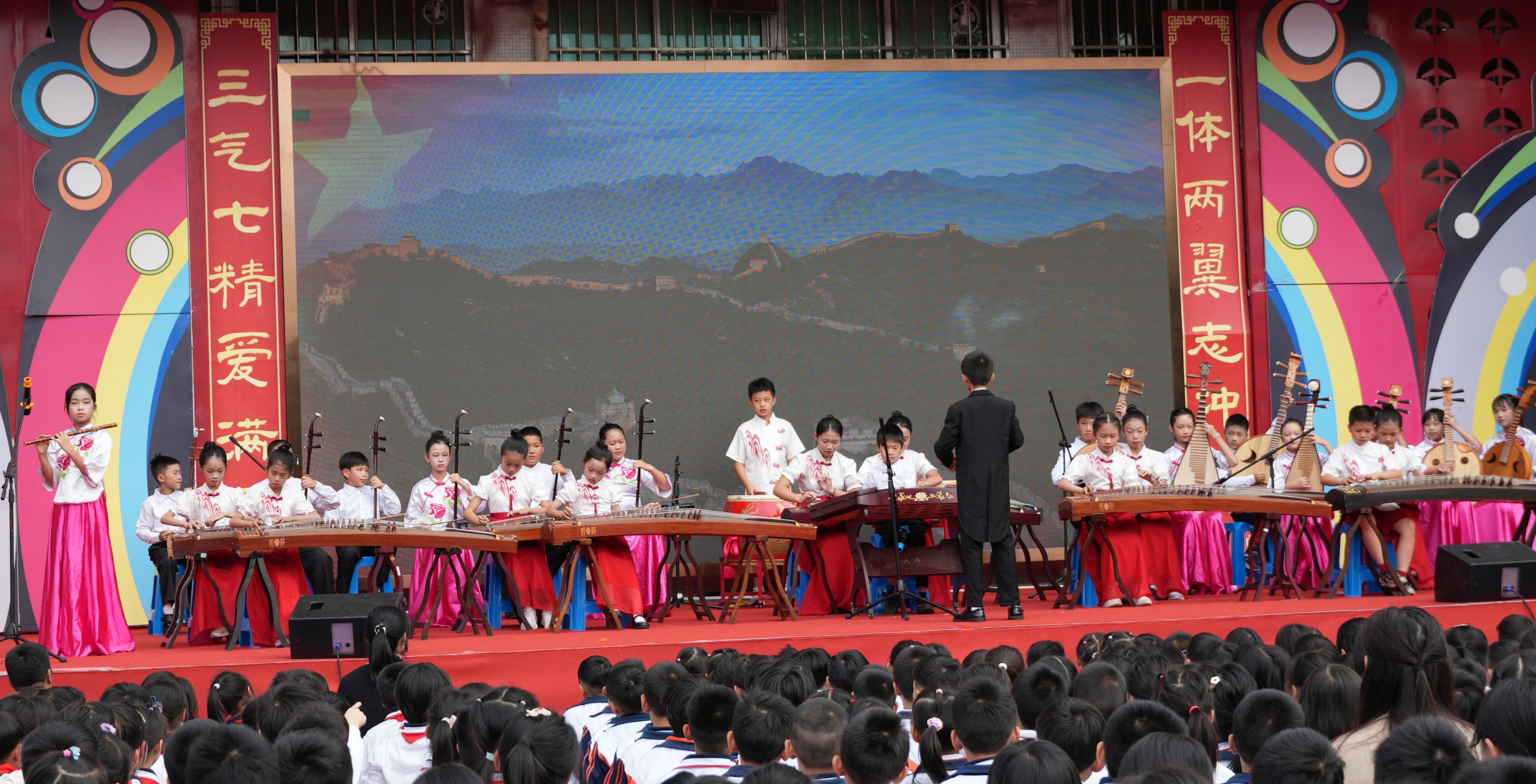 在民乐团气势恢宏的《盛世国乐》中,百年校庆文艺汇演拉开序幕。汇演共分为三个篇章。第一篇章为文化传承,只见舞蹈《大漠乐天》舞姿优美,课本剧《司马光砸缸》生动有趣,舞蹈《十八焕蝶》灵动飘逸。