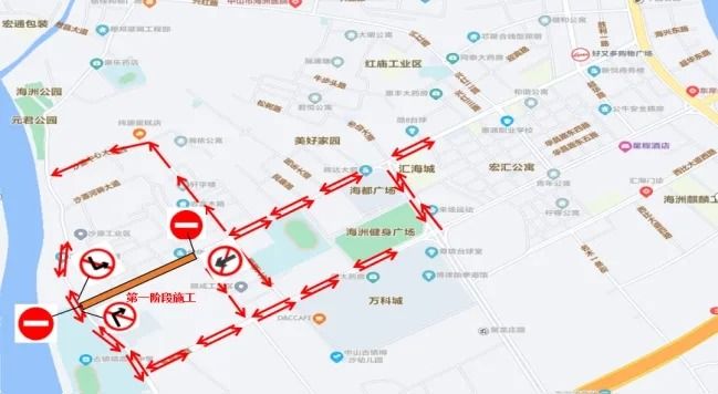 西岸北路往返海兴路方向双向封闭,需绕行东岸西路及沙源工业区方向等道路。请过往车辆按现场交通指示标志减速慢行或提前选择绕道行驶,请广大驾驶员相互知照,提前选择行车路线。