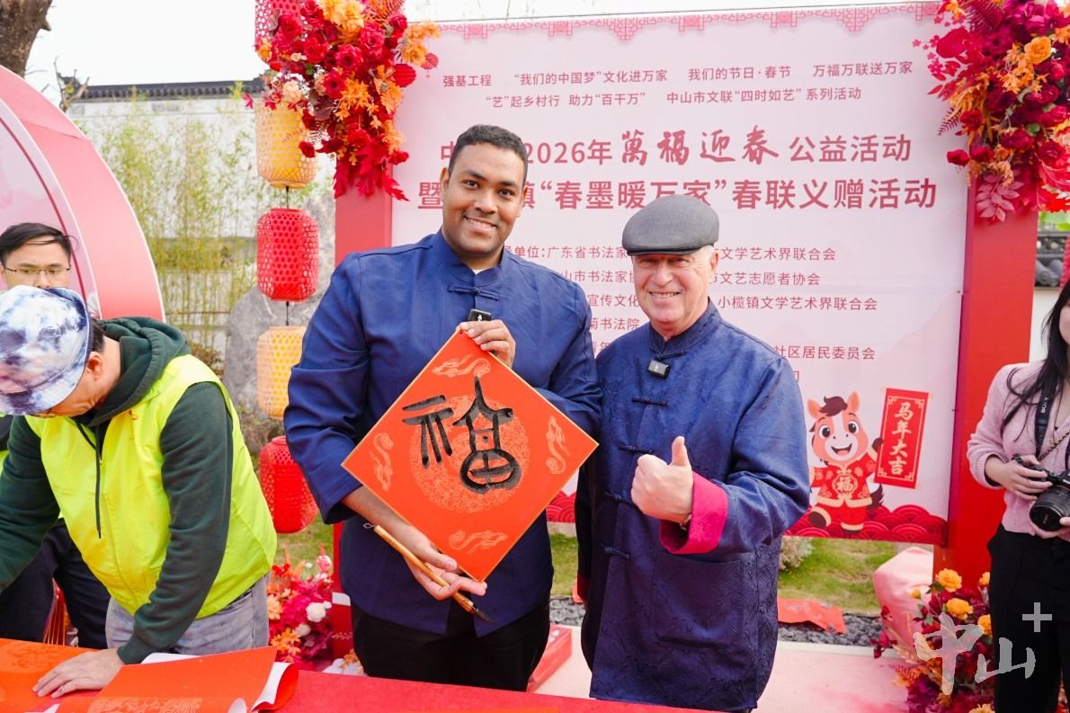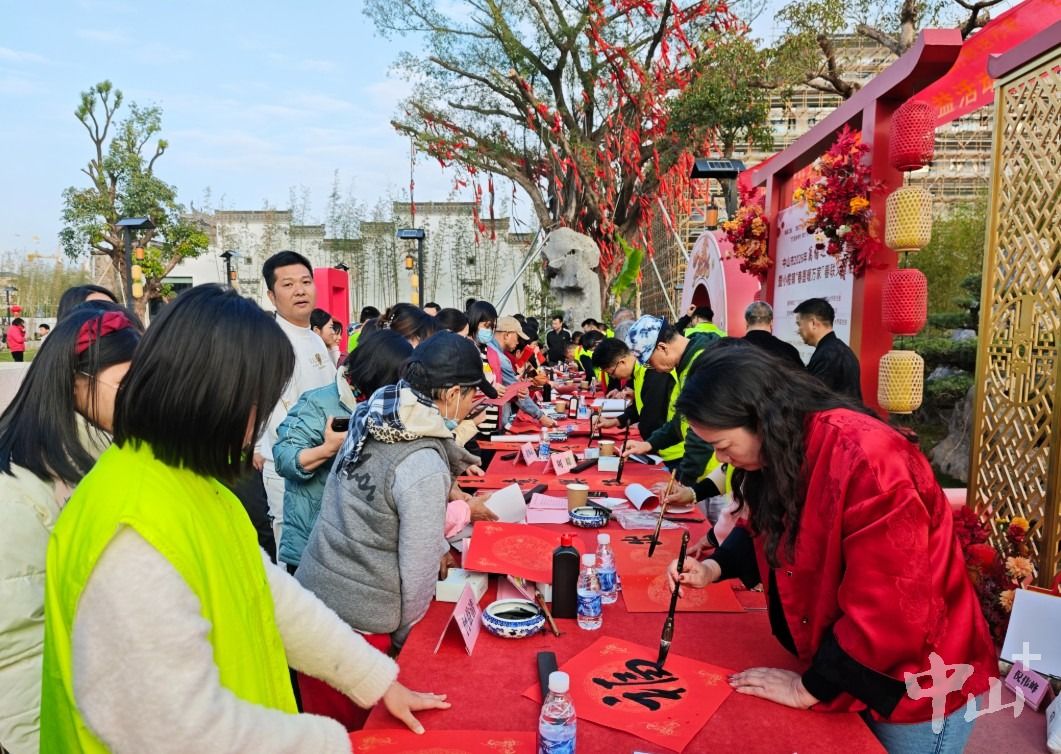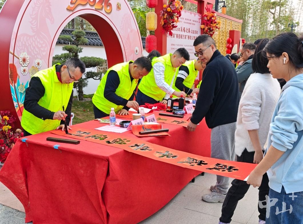 1月31日下午,中山小榄宁徽园徽派建筑群(香山书房一侧)广场上人流涌动,热闹非凡。由中山市书法家协会、中山市文艺志愿者协会、小榄镇宣传文化服务中心、小榄镇文学艺术界联合会、广东榄菊书法院联合主办的中山市2026年“万福迎春”公益活动暨小榄镇"春墨暖万家"春联义赠活动在此举行。