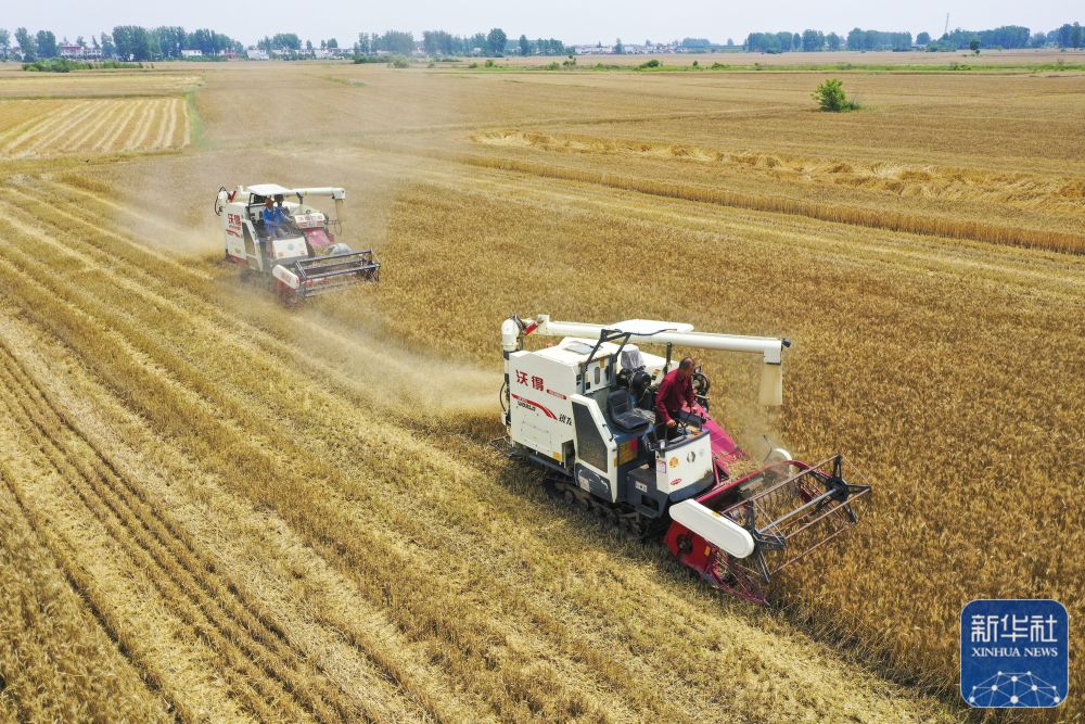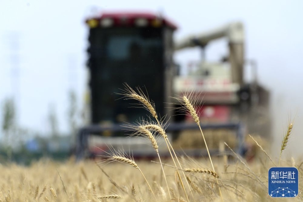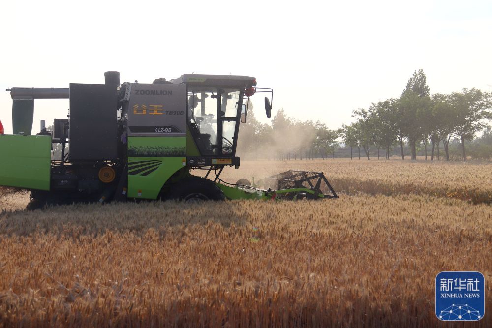 5月25日,农民在河南省驻马店市汝南县宿鸭湖街道十里铺社区收获小麦。新华社发(孙凯摄)