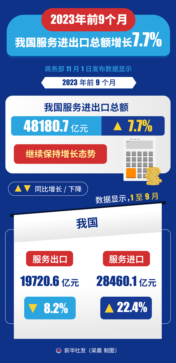 商务部1日发布数据显示,今年前9个月,我国服务进出口总额48180.7亿元,同比增长7.7%,继续保持增长态势。
