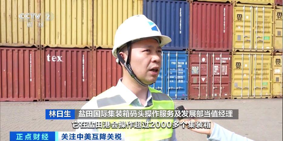盐田国际集装箱码头操作服务及发展部当值经理 林日生:这是去往美国的一艘船,它在盐田港会操作超过2000多个集装箱,非常忙,其他船公司全部都在协调码头来调靠泊位,码头每天都有6班(船舶)去往美国。