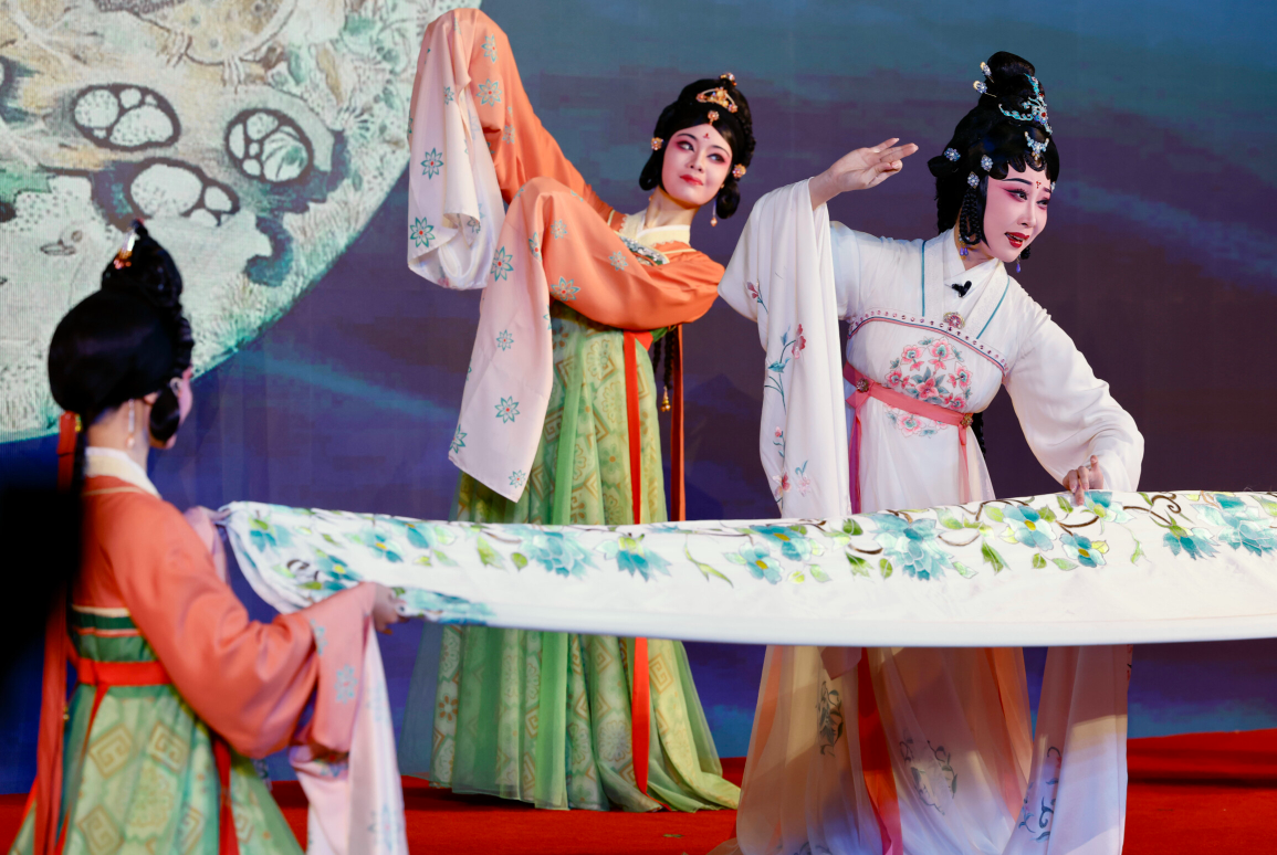 醒狮灵动起舞,英歌铿锵腾跃,在两大岭南非遗亮相迎宾之后,开幕式正式启幕。广州粤剧院带来大型新编古装粤剧《双绣缘》选段,赢得现场阵阵掌声。