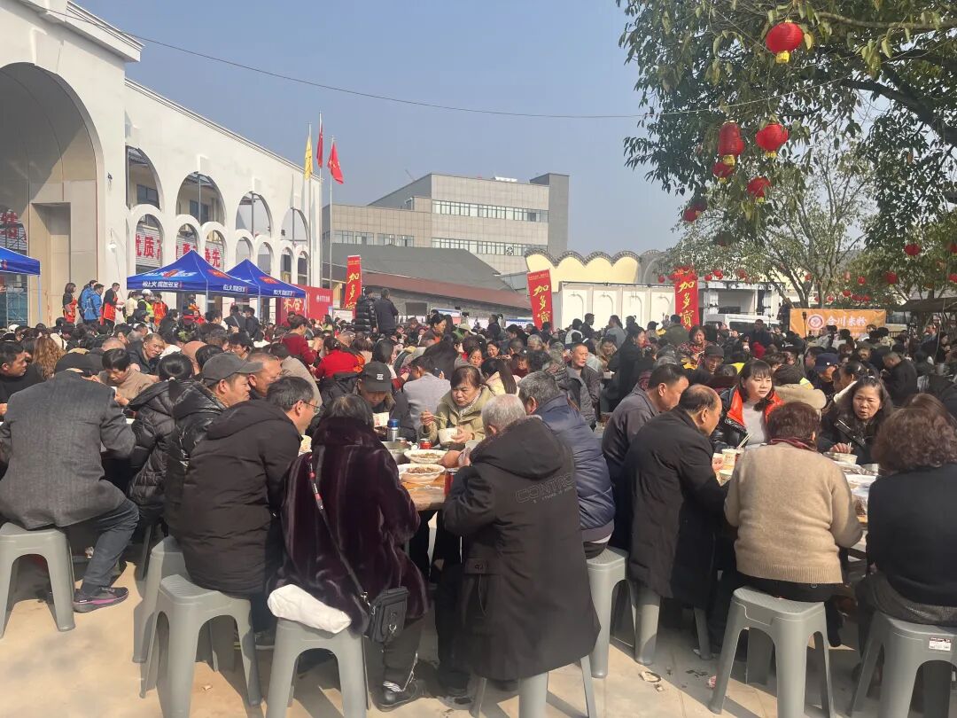 空地上摆了100桌。生态园老板余家友举着瓶饮料挨桌敬。人们握着余家友的手,“余老板大气”“生意兴隆”。