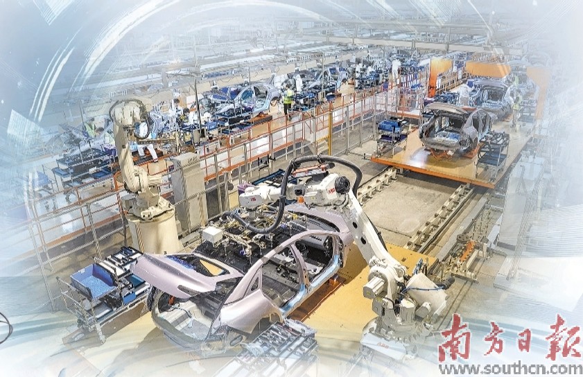 小鹏汽车肇庆工厂智能产线,机械臂协同装配汽车车身。南方日报记者 张令 摄