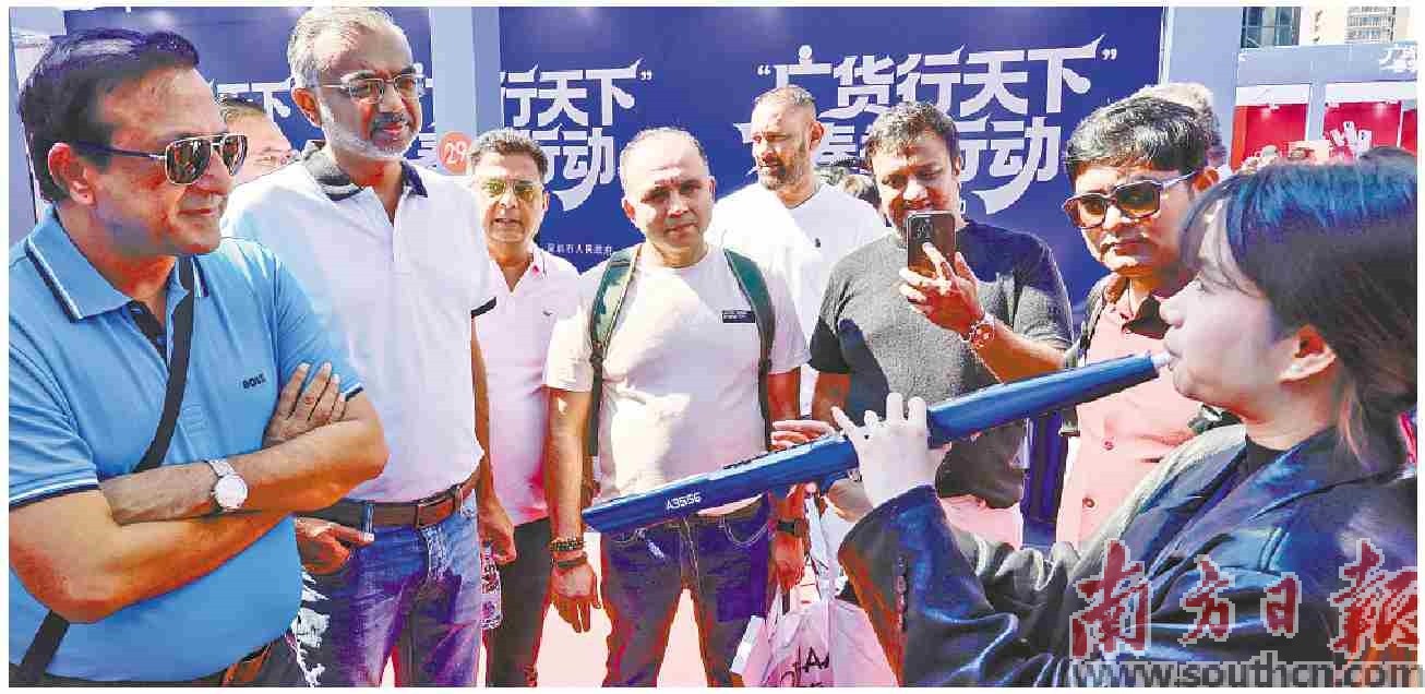 外籍客商在现场欣赏商家展示数码笛发出的优美音乐。南方日报记者 鲁力 摄