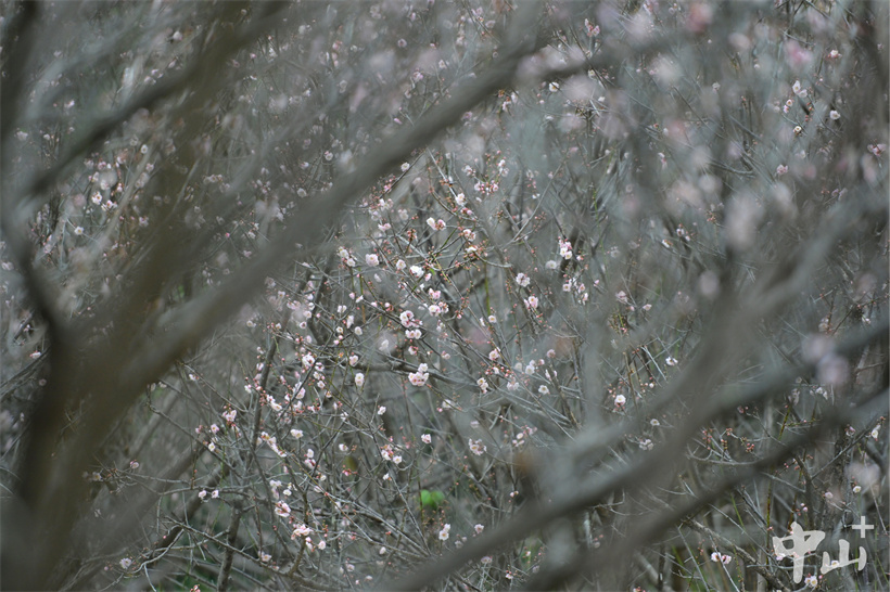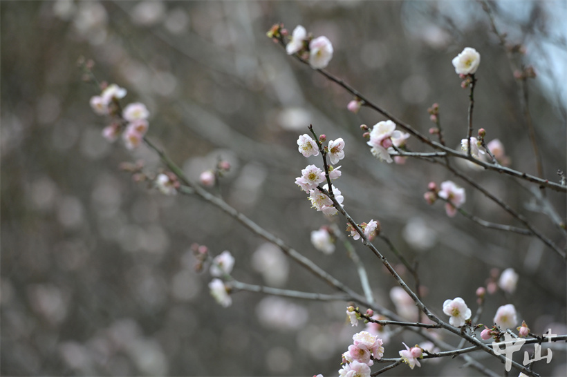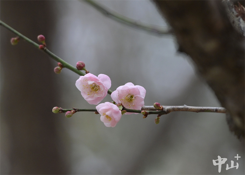▲淡粉色的梅花为寒冬增添了温暖而柔和的色彩。