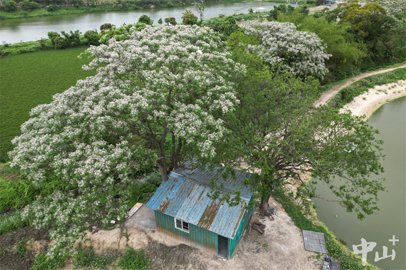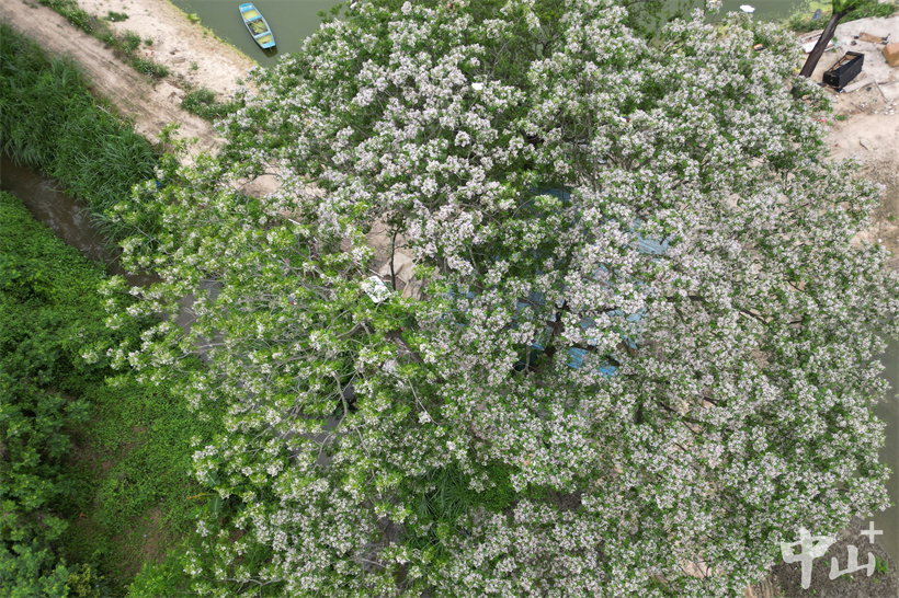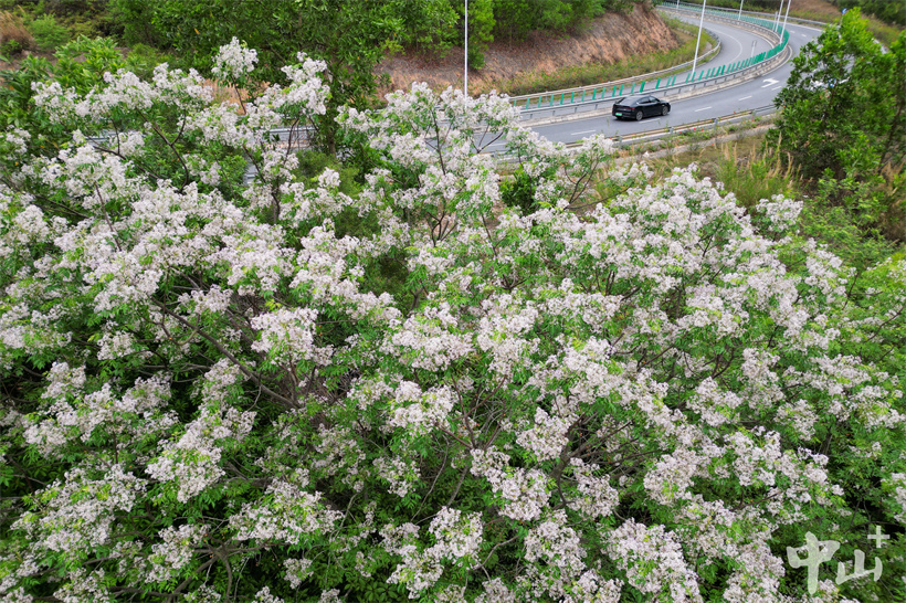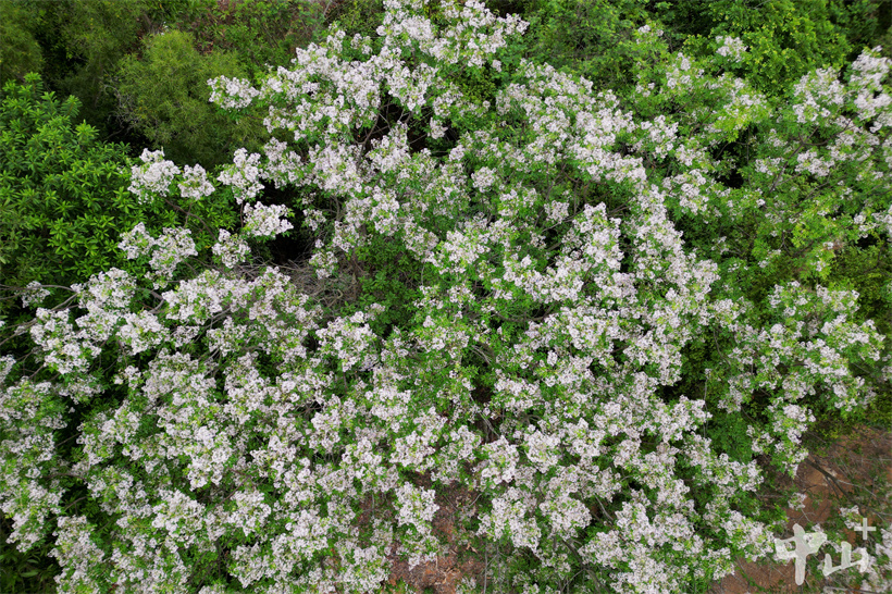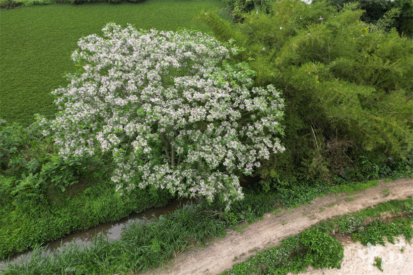 ▲从高空俯瞰,整棵苦楝树像被一场春日的 “雪” 彻底覆盖。