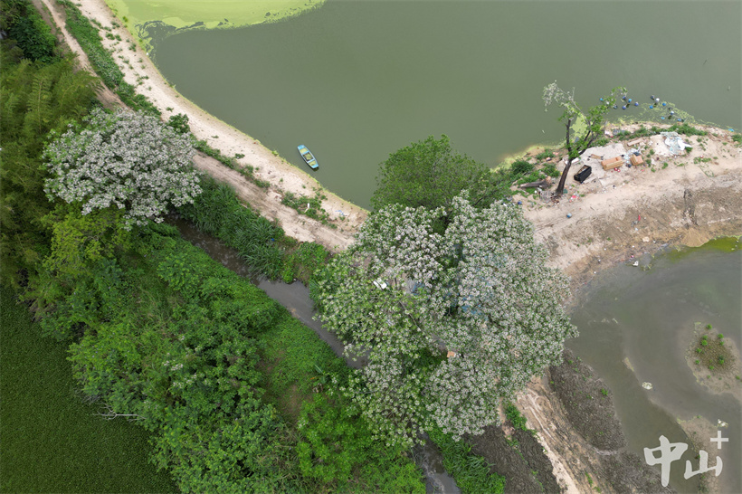 ▲满树开花的苦楝树将鱼塘春色渲染得更浓。
