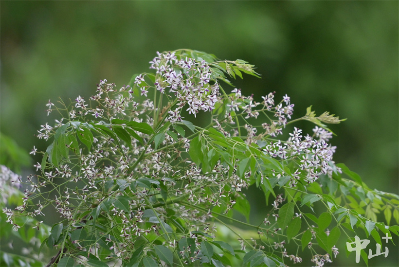 ▲盛开的楝花如同一块花布盖在树顶上。