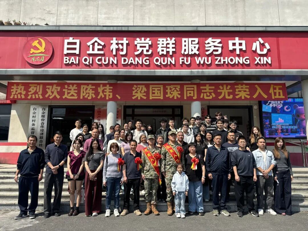 3月12日下午,中山白企村党群服务中心内洋溢着庄重而热烈的气氛,2026年度新兵入伍欢送仪式在此隆重举行。村党总支书记甘社建率领村“两委”班子成员及全体工作人员,共同为光荣入伍的陈炜、梁国琛二位同志送行,向投身国防事业的青年致以崇高敬意,并向支持国防建设的军属表达诚挚感谢。